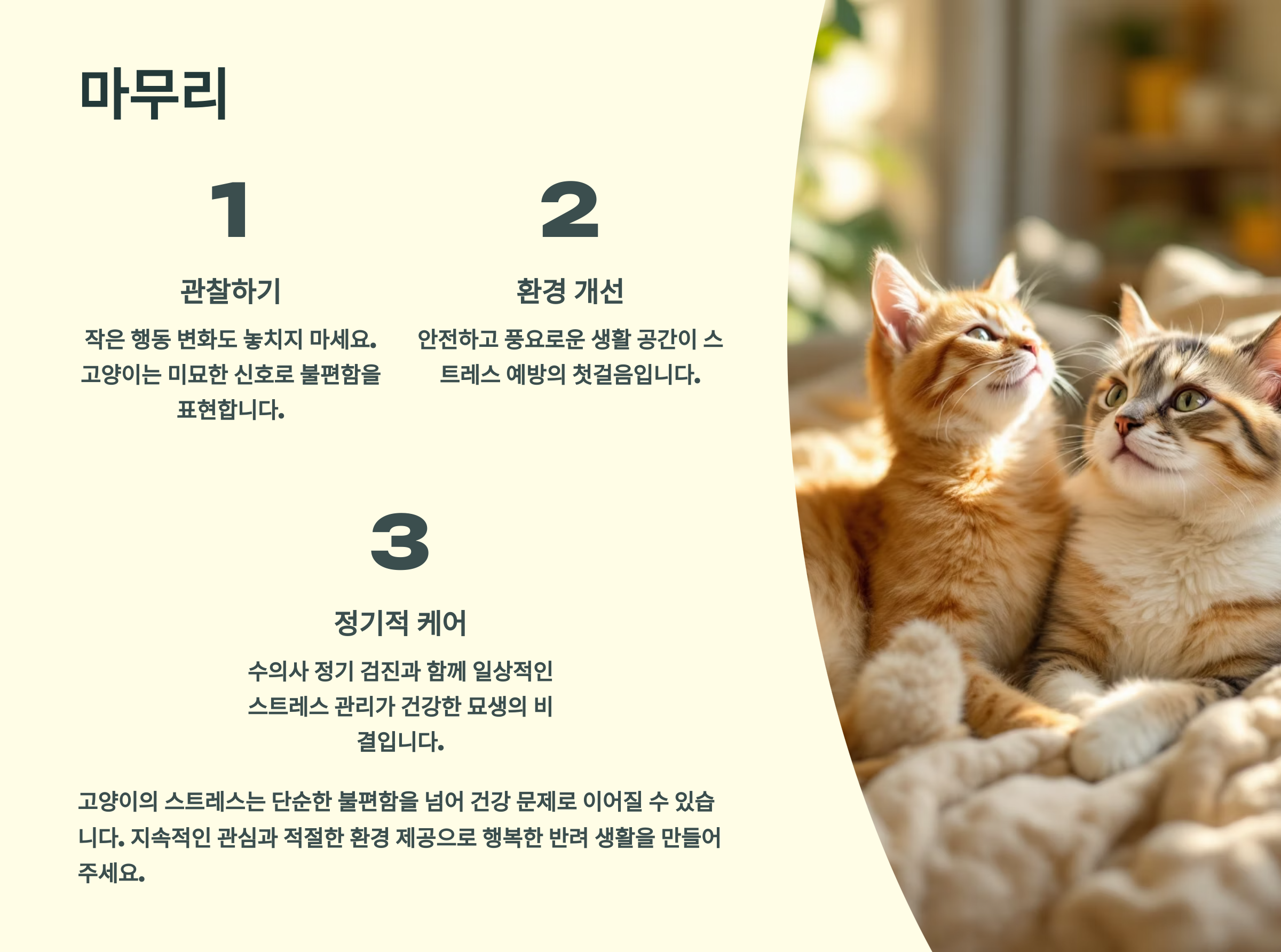 스트레스는 고양이의 몸과 마음을 동시에 흔들 수 있어요. 그만큼 원인을 정확히 아는 게 중요하고, 이후 행동 변화를 빠르게 캐치하는 게 핵심이랍니다.
