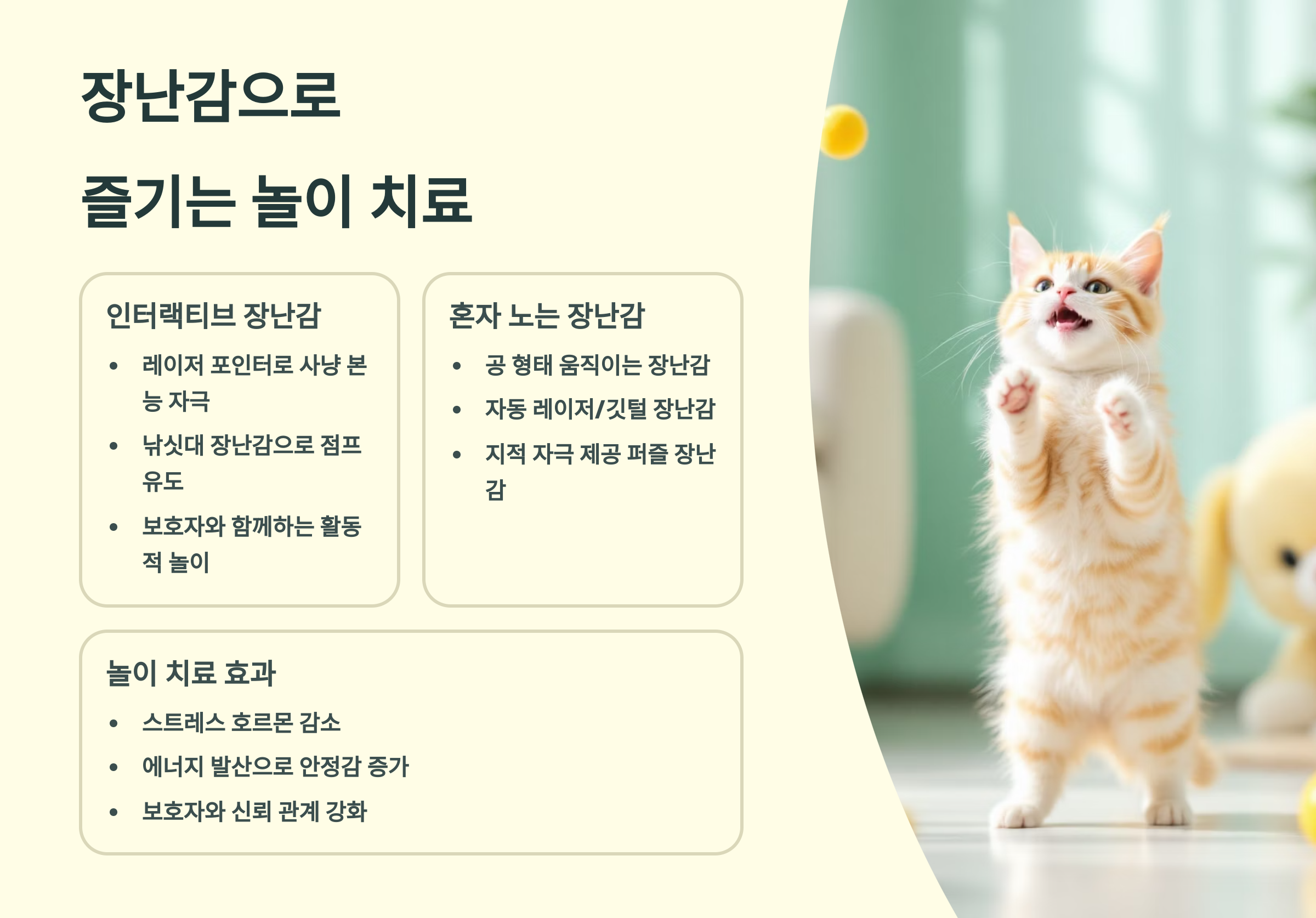 | 자동 회전 장난감 | 집사가 없을 때도 혼자 놀이 가능 | 혼자 있는 시간이 많은 아이 |