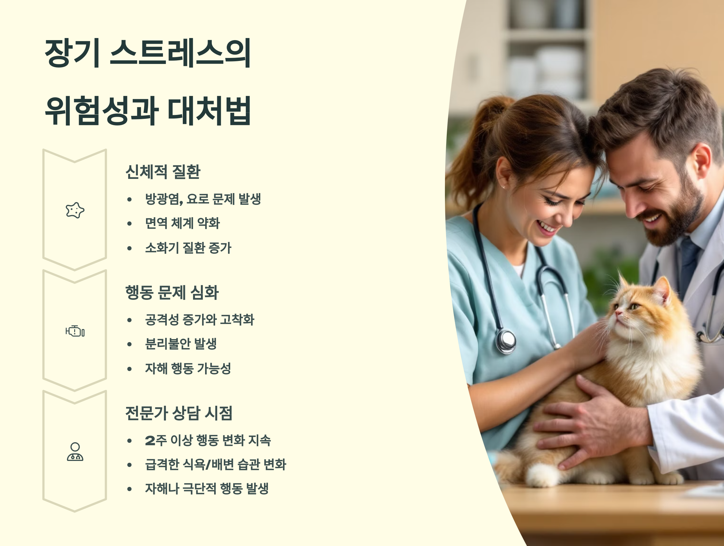 스트레스성 질환이 의심될 경우 수의사 진료 + 행동상담 + 환경 점검이 병행되어야 해요. 단순히 약을 먹이는 것보다 원인을 함께 관리하는 것이 훨씬 근본적인 해결책이 되거든요.