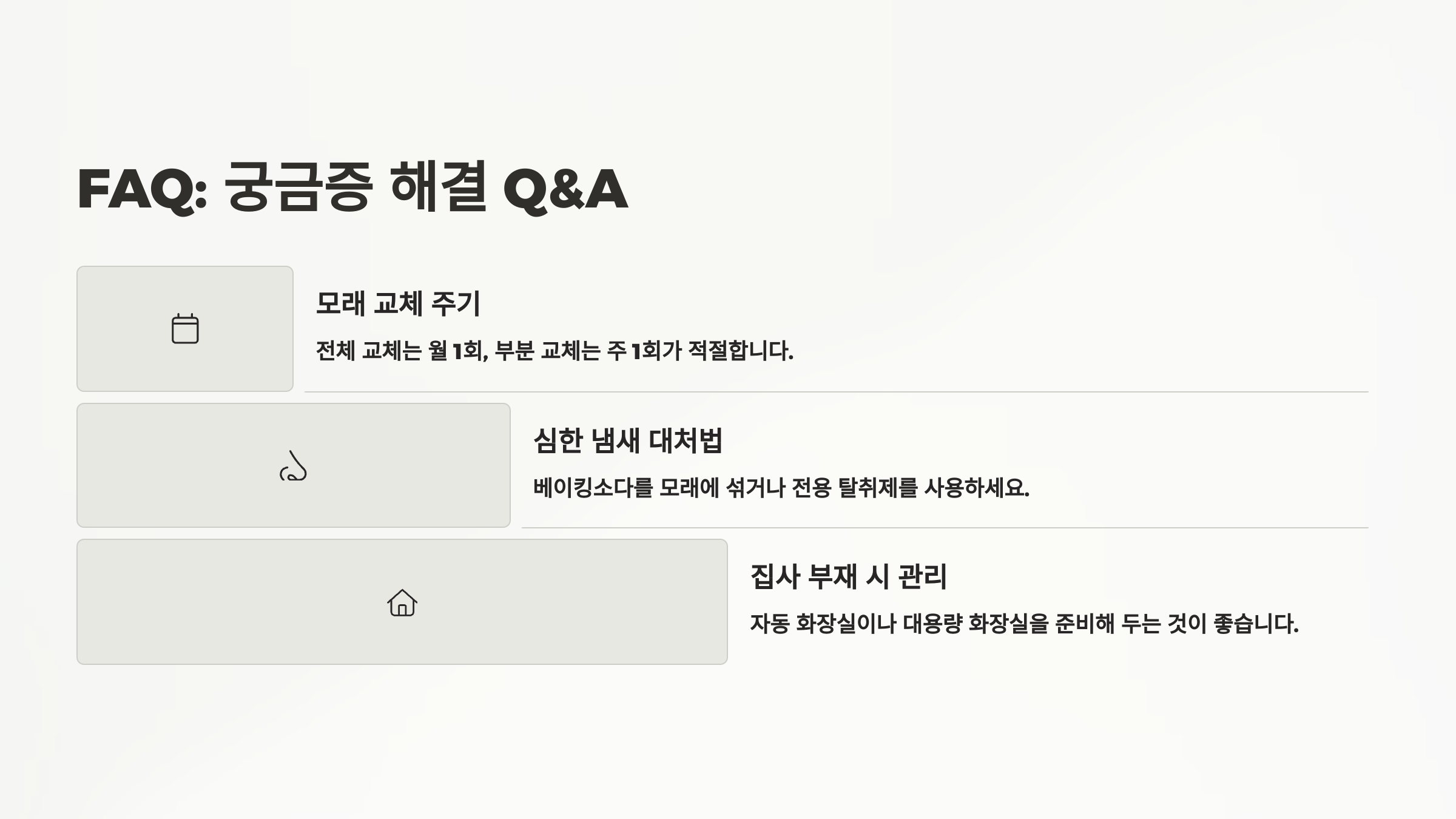 | 모래 전량 교체 | 오래된 모래 완전 비우기 | 1주 1회 |