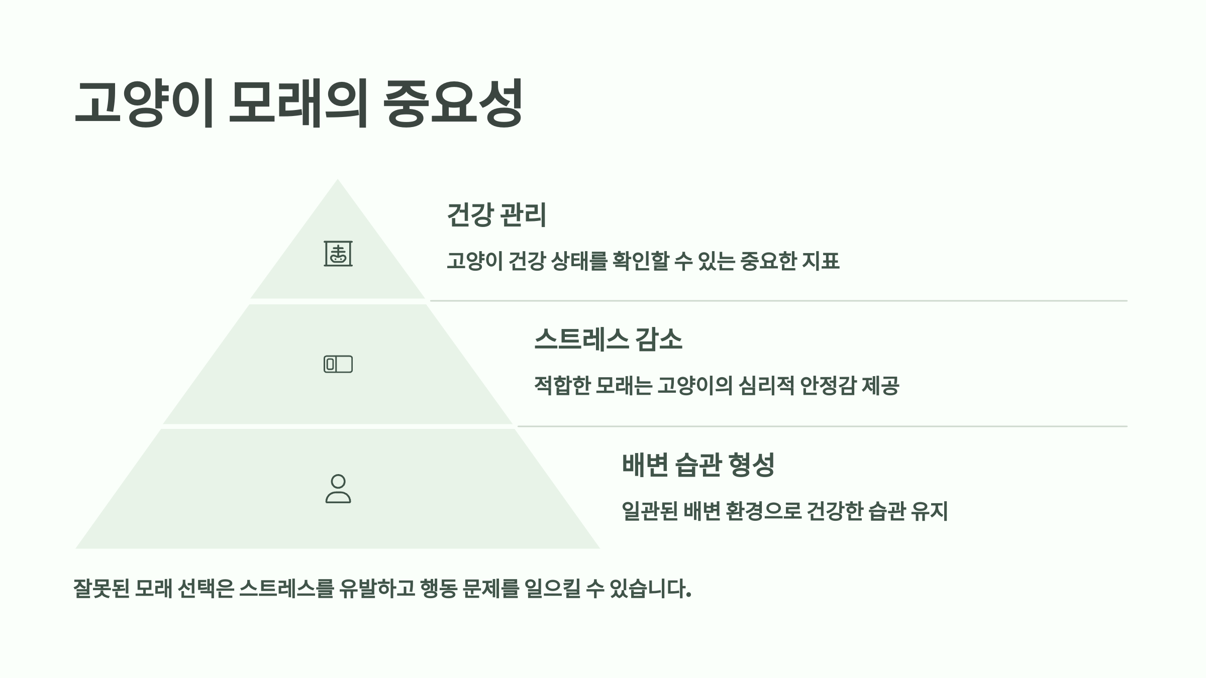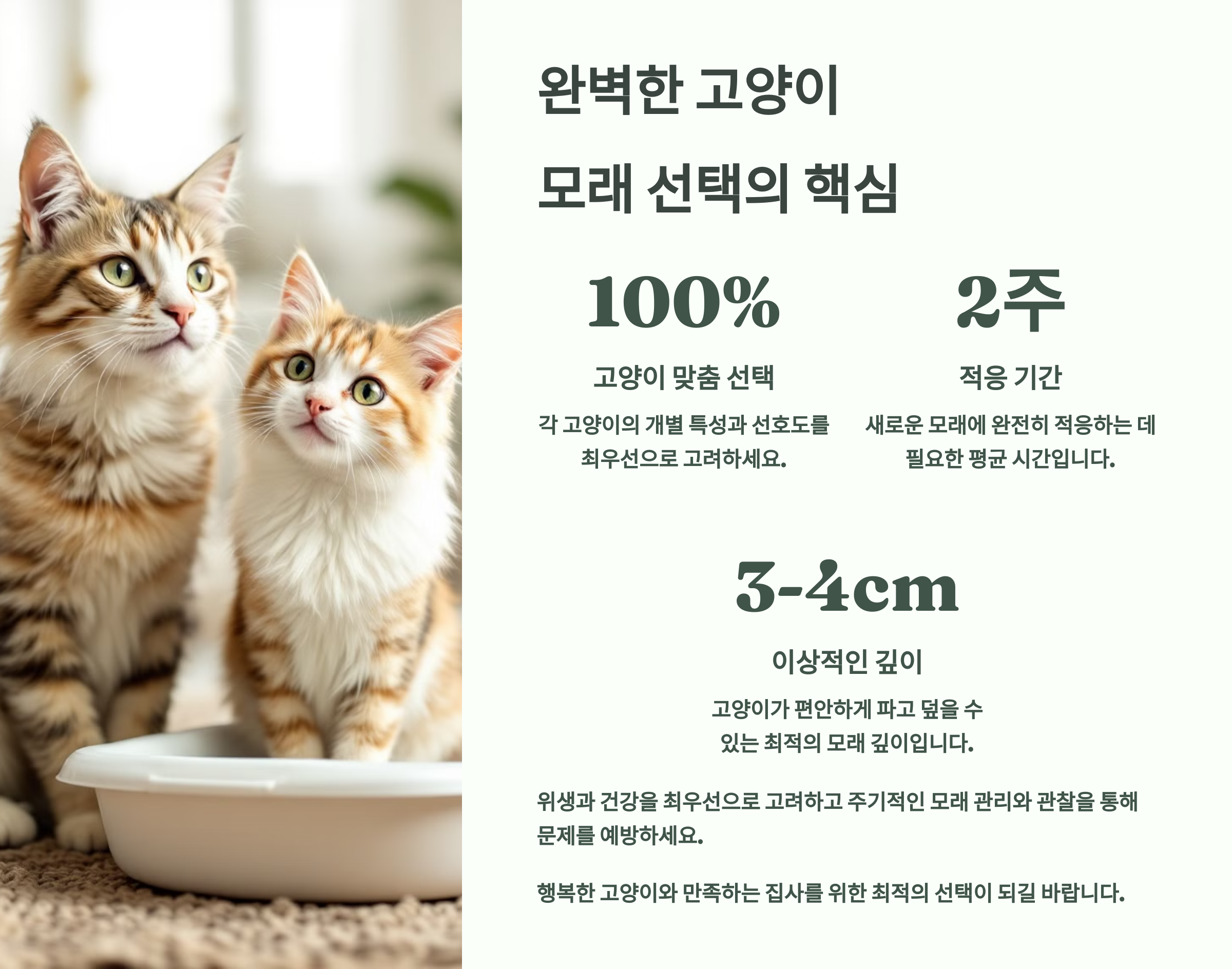 🏠 고양이 모래는 고양이의 배변 습관을 책임지는 가장 핵심적인 제품이에요. 고양이는 아주 청결한 동물이라 화장실 환경이 마음에 들지 않으면 다른 곳에 실례하거나 화장실 사용을 거부할 수 있어요.