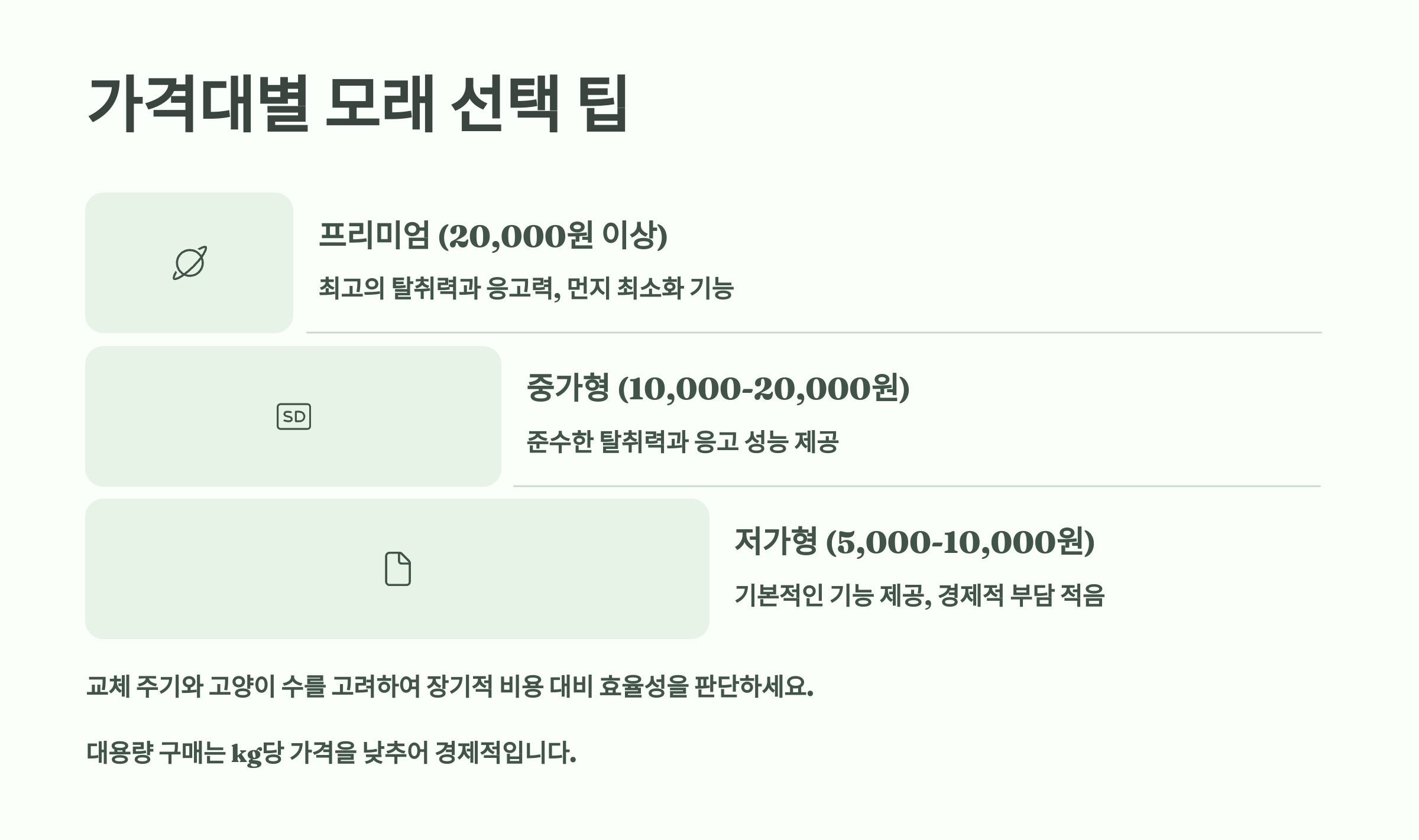 다음은 👉 💰 가격대별 모래 선택 팁 섹션이에요! 1만원 이하부터 프리미엄 라인까지, 예산별로 어떤 모래가 좋은지 알려드릴게요! 💸🧾