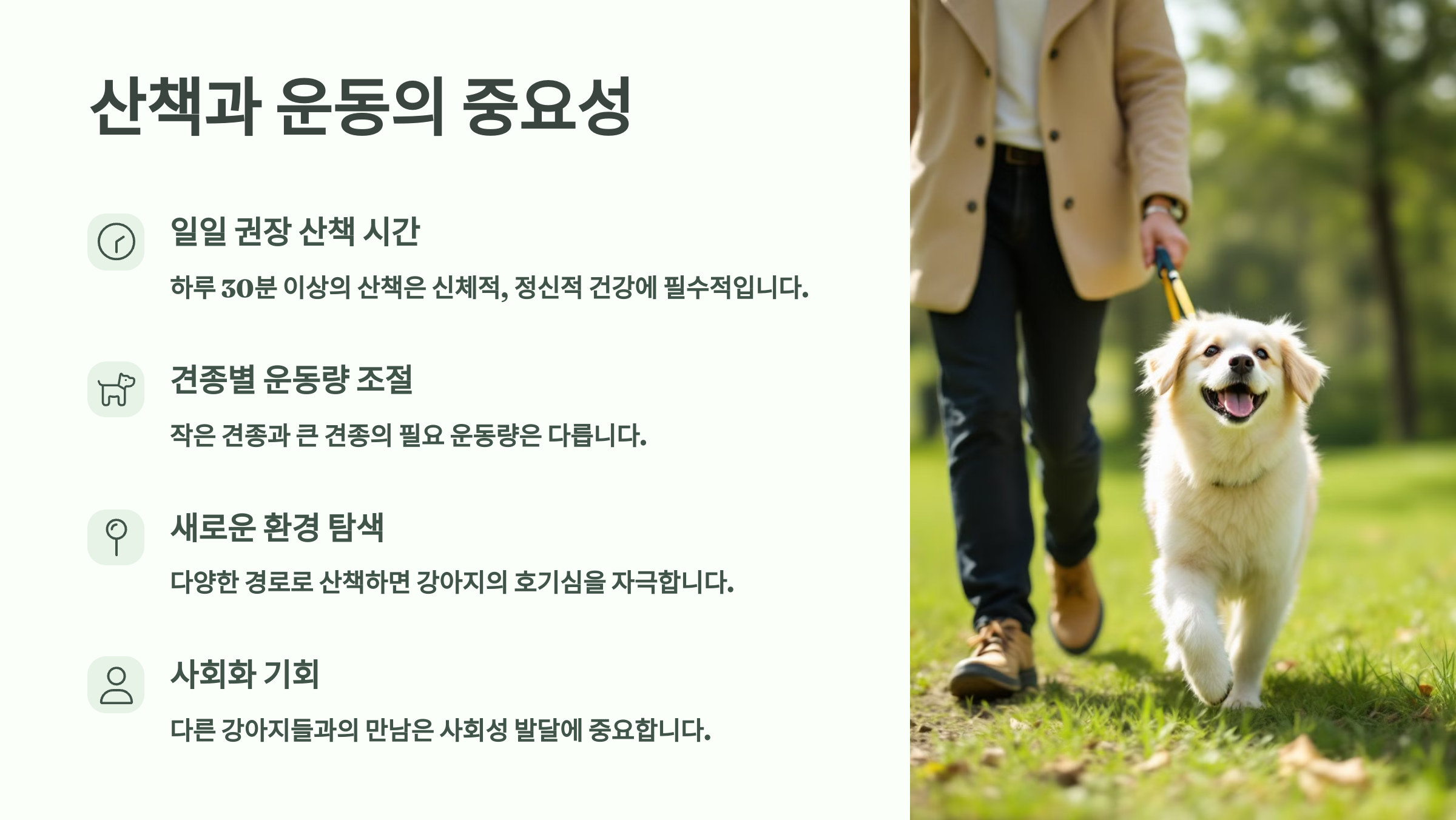 🚶 강아지에게 산책은 단순한 활동이 아니라, 세계를 탐험하는 시간이에요. 새로운 냄새, 소리, 환경은 강아지의 뇌를 자극하고 스트레스를 해소하는 데 탁월하답니다.