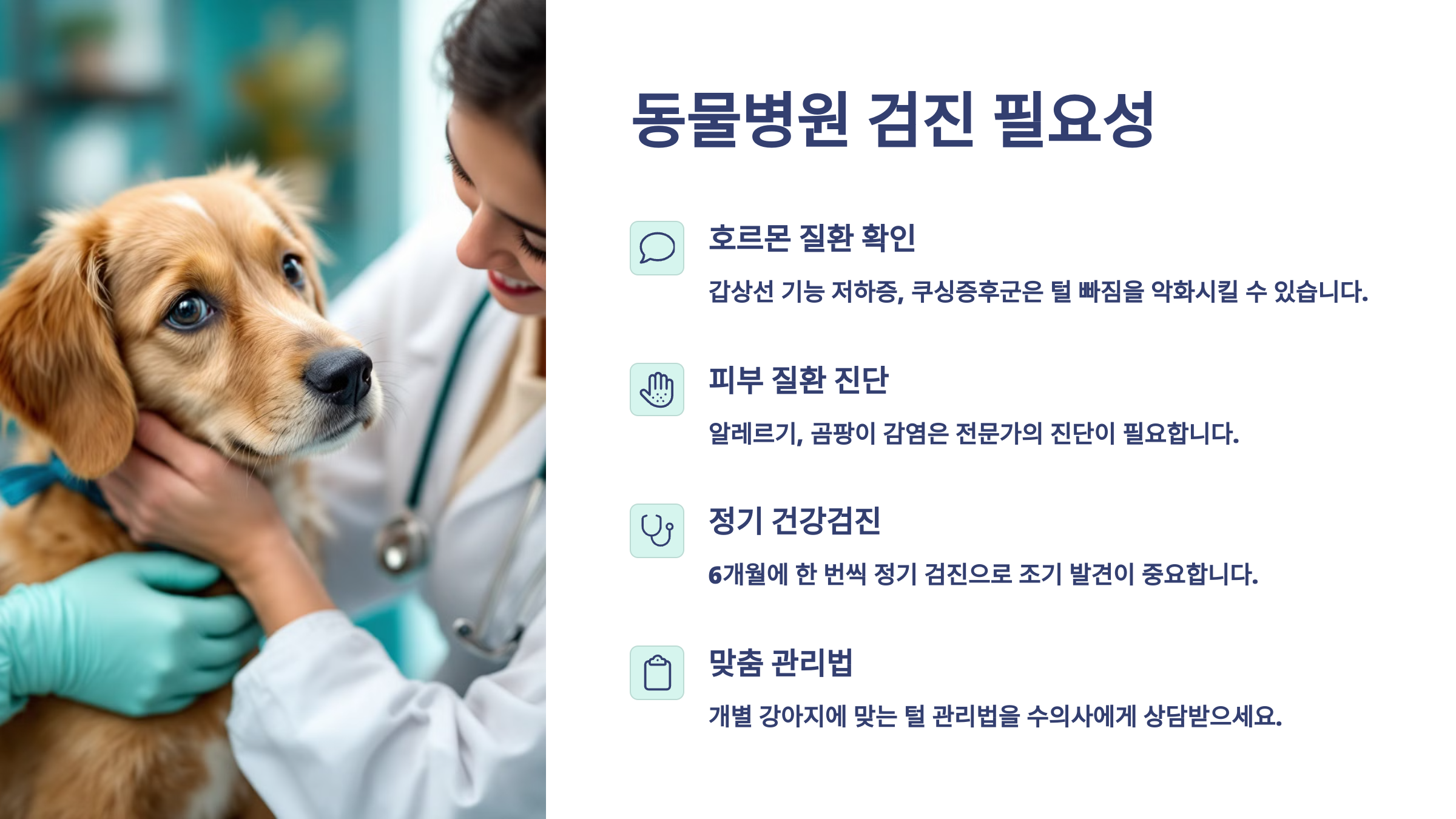 🔬 수의사는 피모 상태, 식단, 알러지 여부 등을 종합적으로 분석해서 가장 적절한 치료 방법을 제시해줘요. 간단한 약 처방이나 샴푸 교체만으로도 털 빠짐이 눈에 띄게 줄어드는 경우도 있답니다.