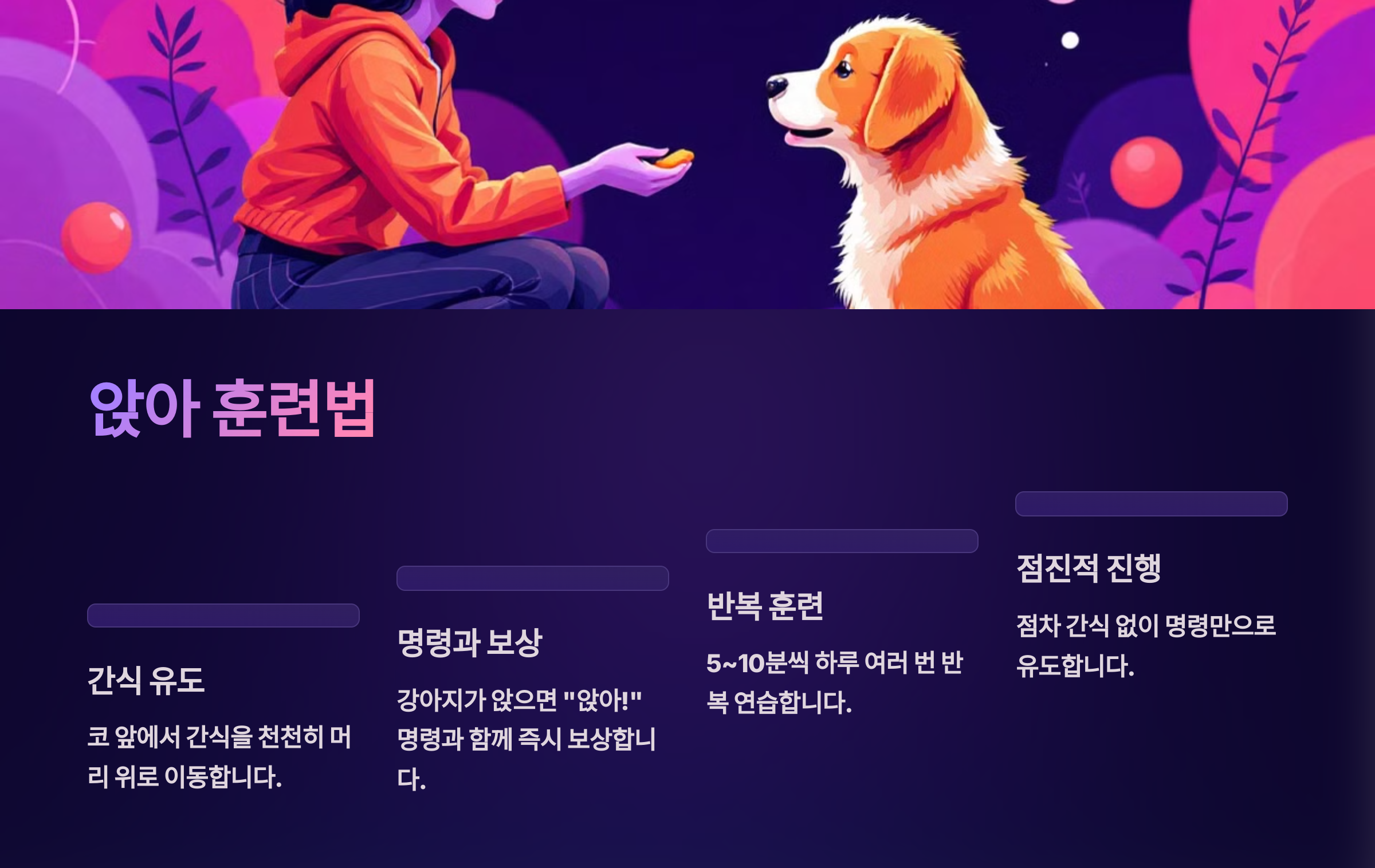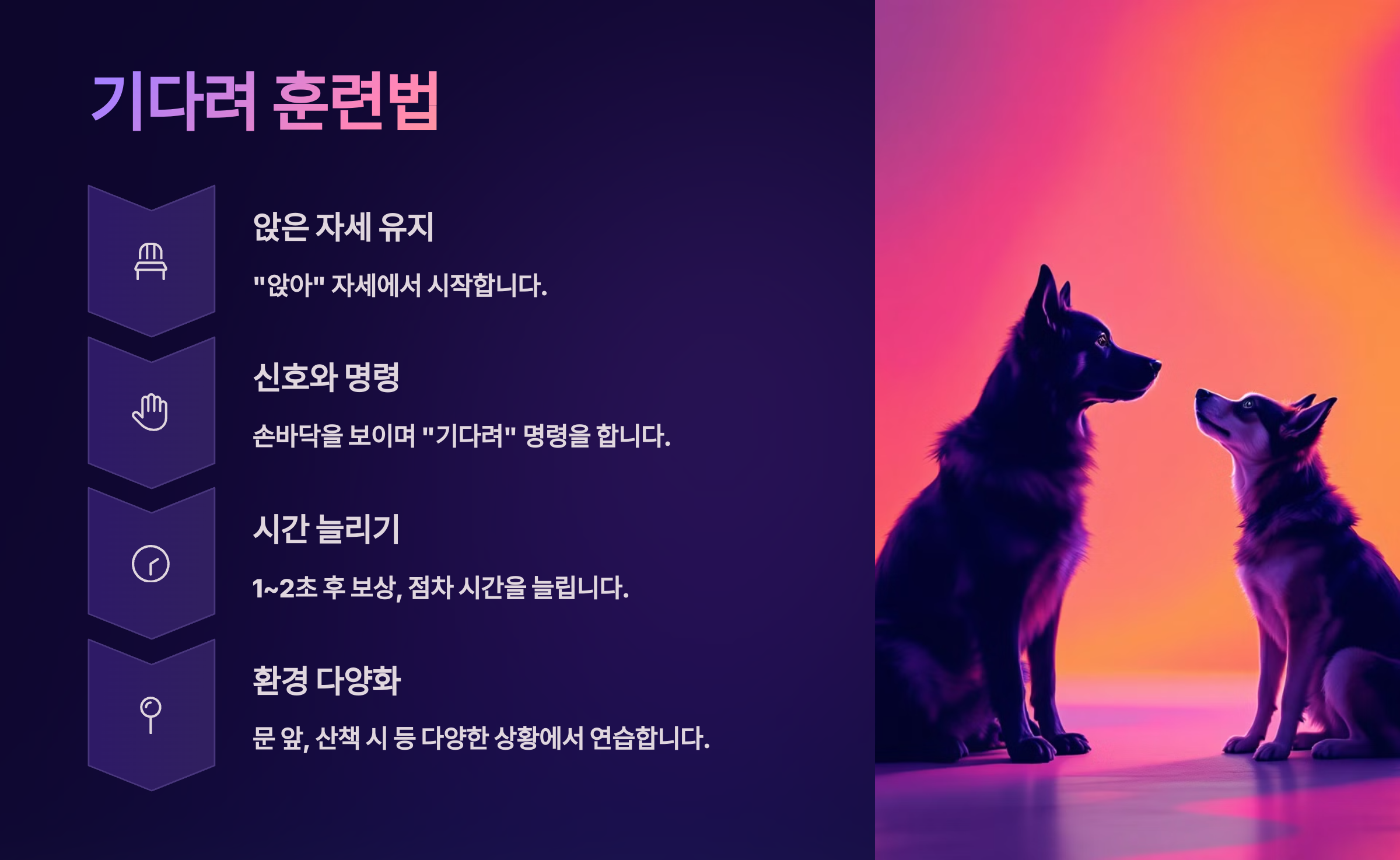 | 명령어 입력 | 앉는 순간 “앉아!” | 앉기 전엔 말하지 않기 |