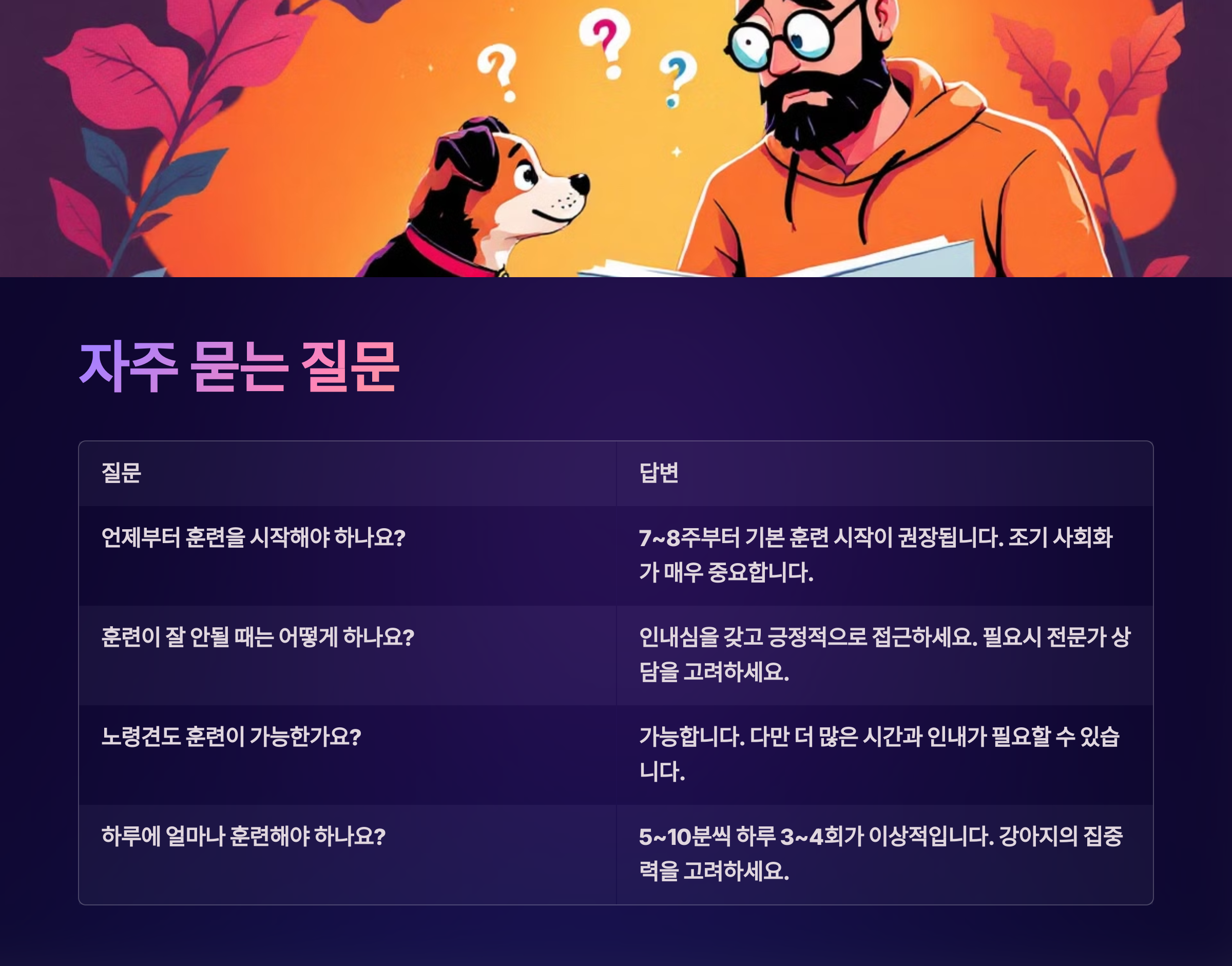 A1. 생후 2~3개월부터 간단한 훈련은 가능해요. 앉아, 이름 부르기, 화장실 훈련부터 차근히 시작해보세요!