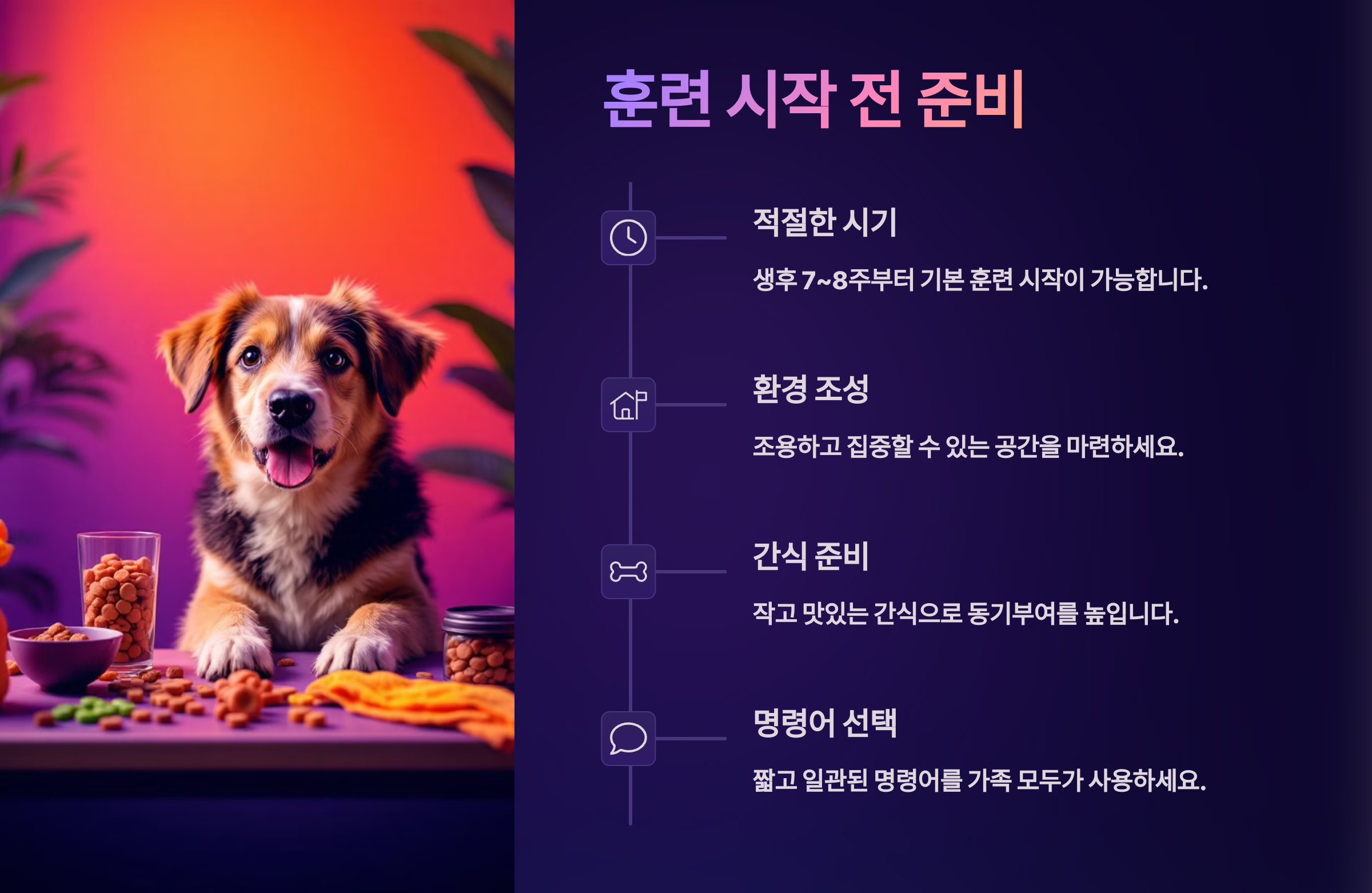 - 2. 반복은 짧고 자주: 한 번에 너무 오래 훈련하면 집중력이 떨어지고 싫어하게 돼요.
