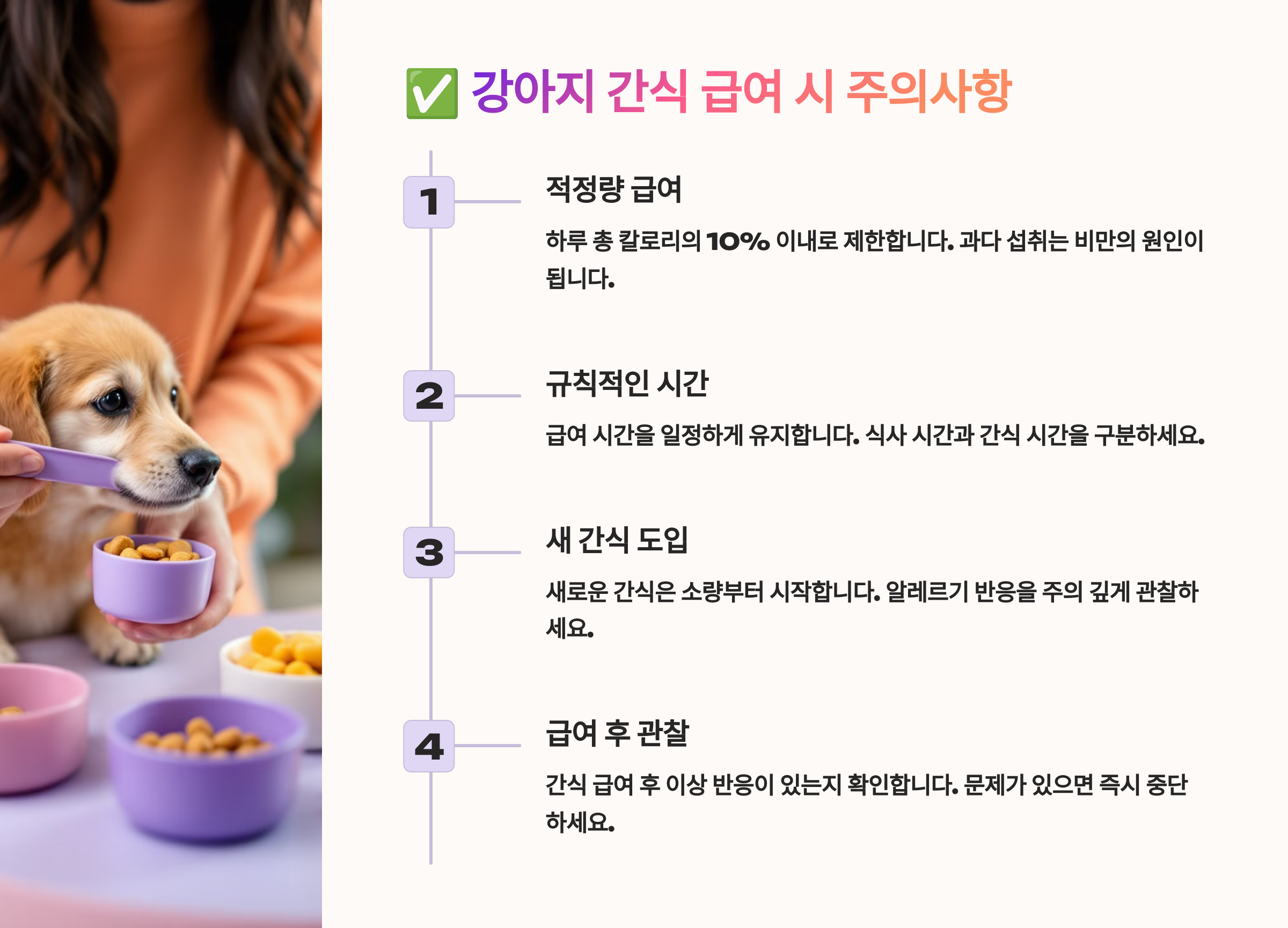 강아지에게 간식을 줄 때는 적절한 양과 타이밍이 중요해요. 과하게 주면 비만, 영양 불균형이 생길 수 있어요! 🐶⚠️