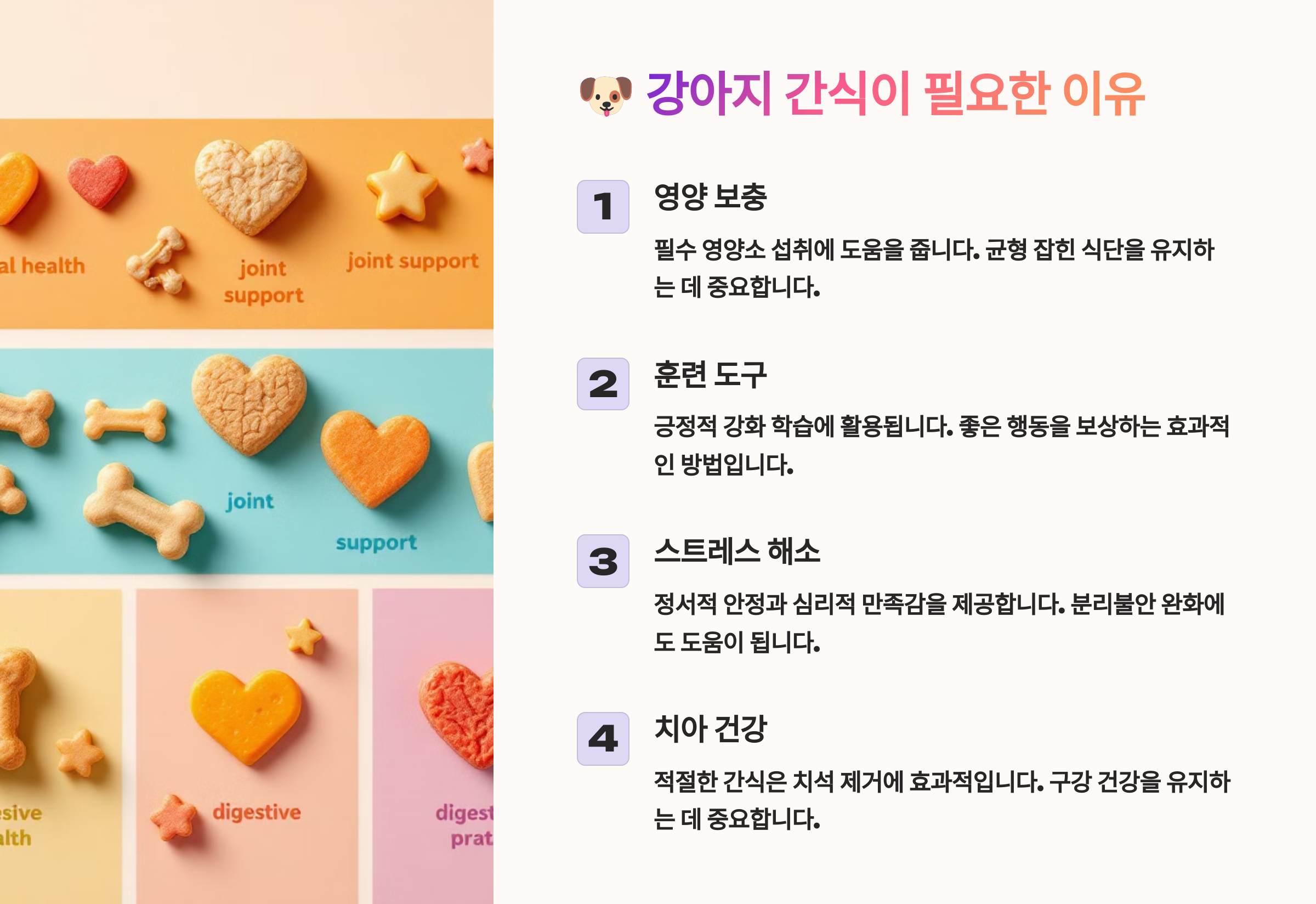 강아지 간식은 훈련 보상, 스트레스 해소, 영양 보충에 도움이 돼요! 🦴🐕 건강하고 안전한 간식을 선택하는 것이 중요해요. 😊