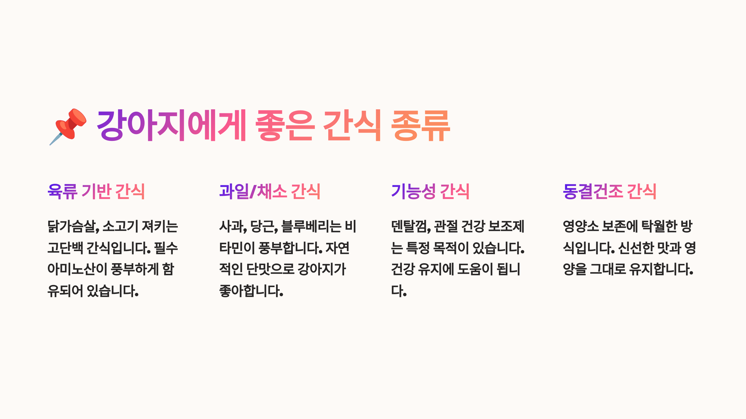 강아지에게 간식은 단순한 먹을거리가 아니라, 훈련 보상, 건강 관리, 기분 전환 등의 역할을 해요. 적절한 간식을 급여하면 강아지의 행복과 건강을 함께 챙길 수 있어요! 🐕💕