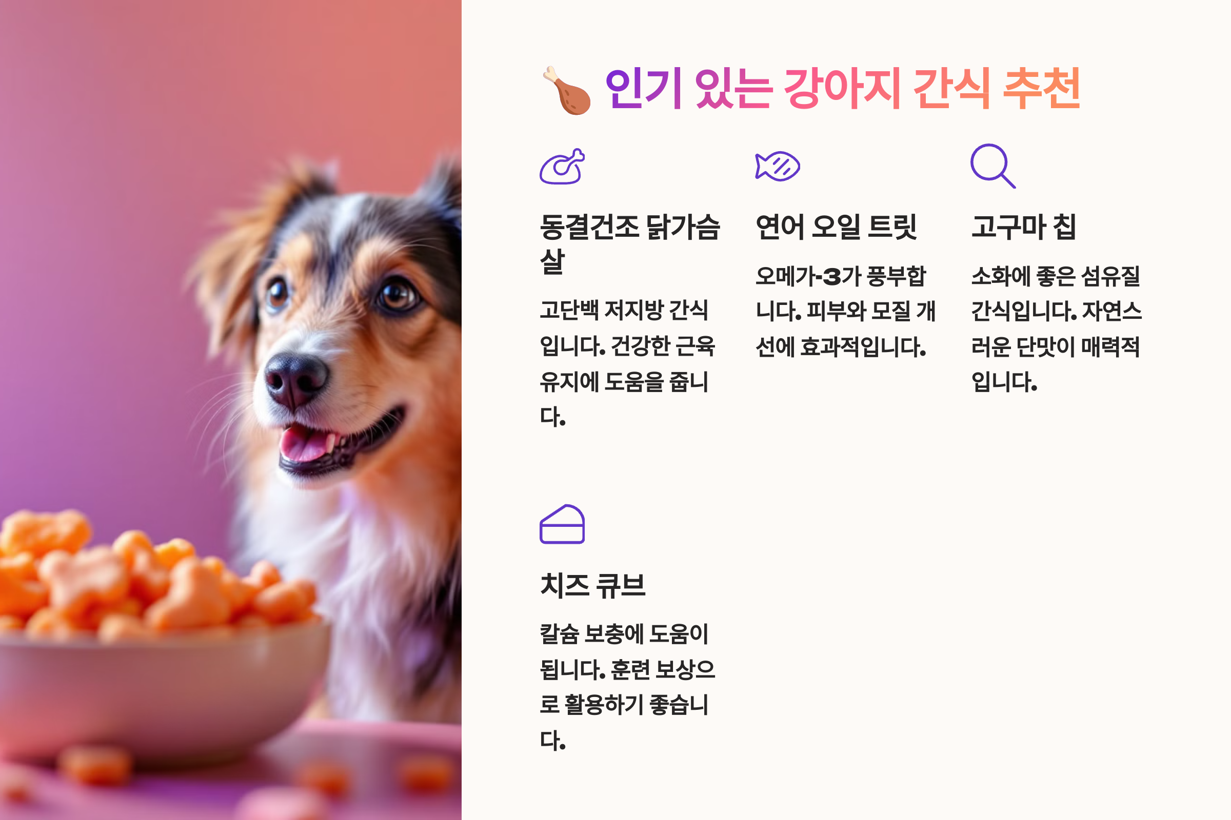 | 고단백 간식 | 운동량 많은 강아지 | 근육 유지, 활력 보충 |