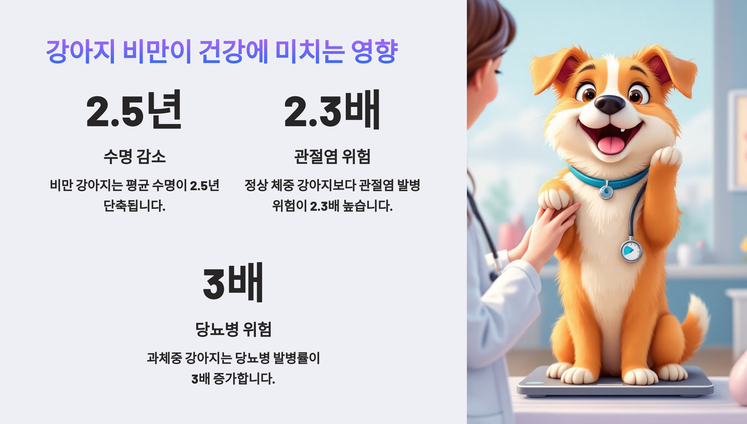 - ❌ 수명 단축: 연구에 따르면 비만 강아지는 평균 수명이 2년 단축돼요.