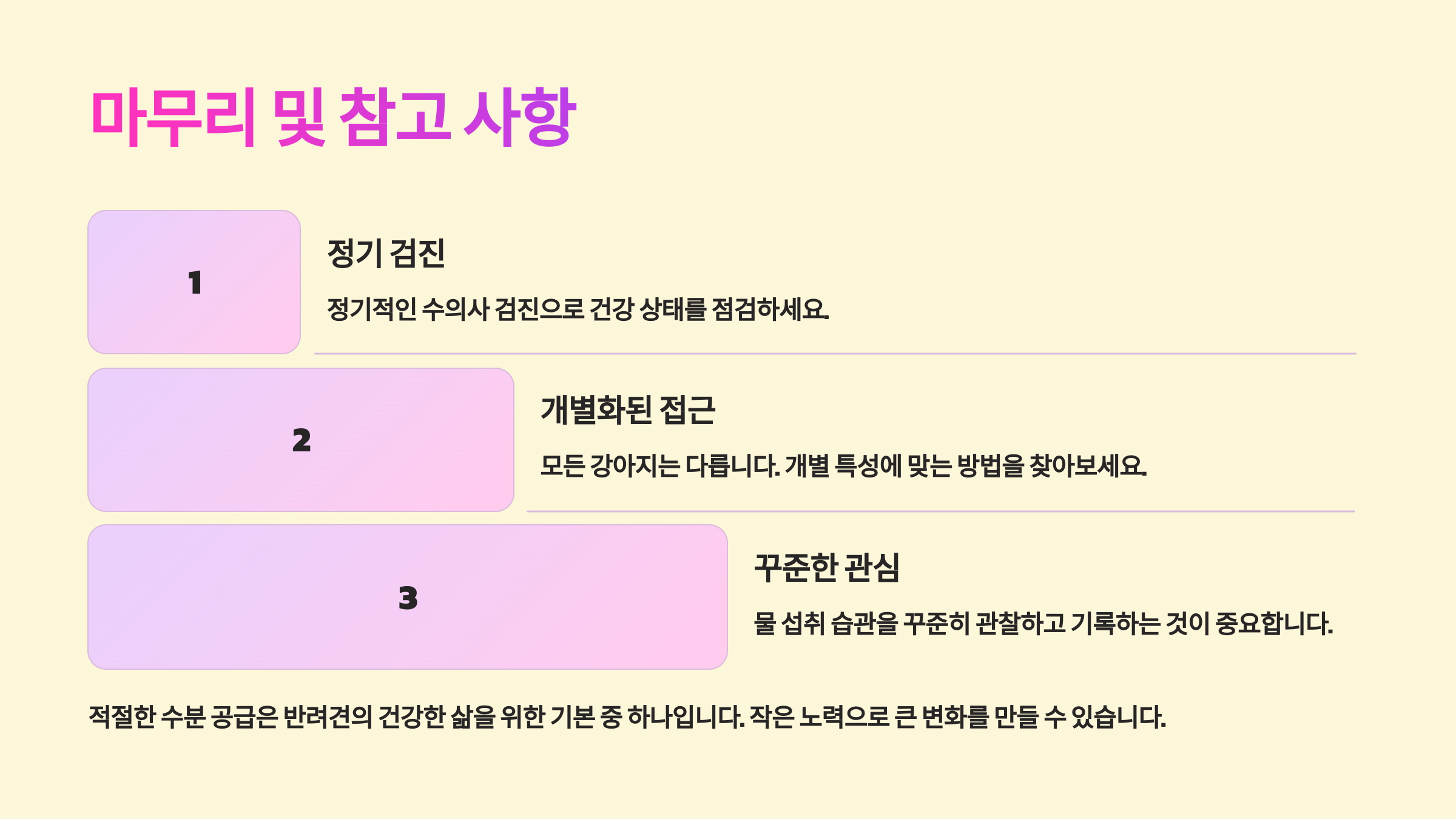 💡 작은 변화만으로도 강아지의 건강을 지킬 수 있어요! 지금부터 강아지가 충분한 물을 마실 수 있도록 도와주세요. 😊