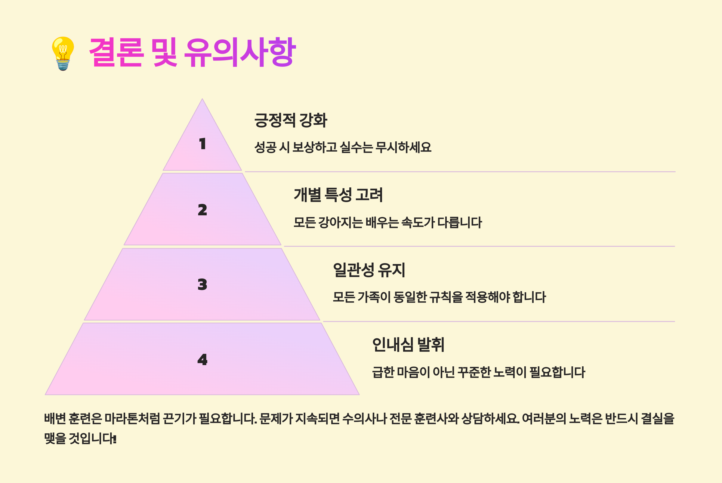 💡 하지만 너무 걱정하지 마세요! 강아지는 본능적으로 깨끗한 환경을 좋아하기 때문에, 올바른 방법으로 훈련하면 누구나 성공할 수 있어요.