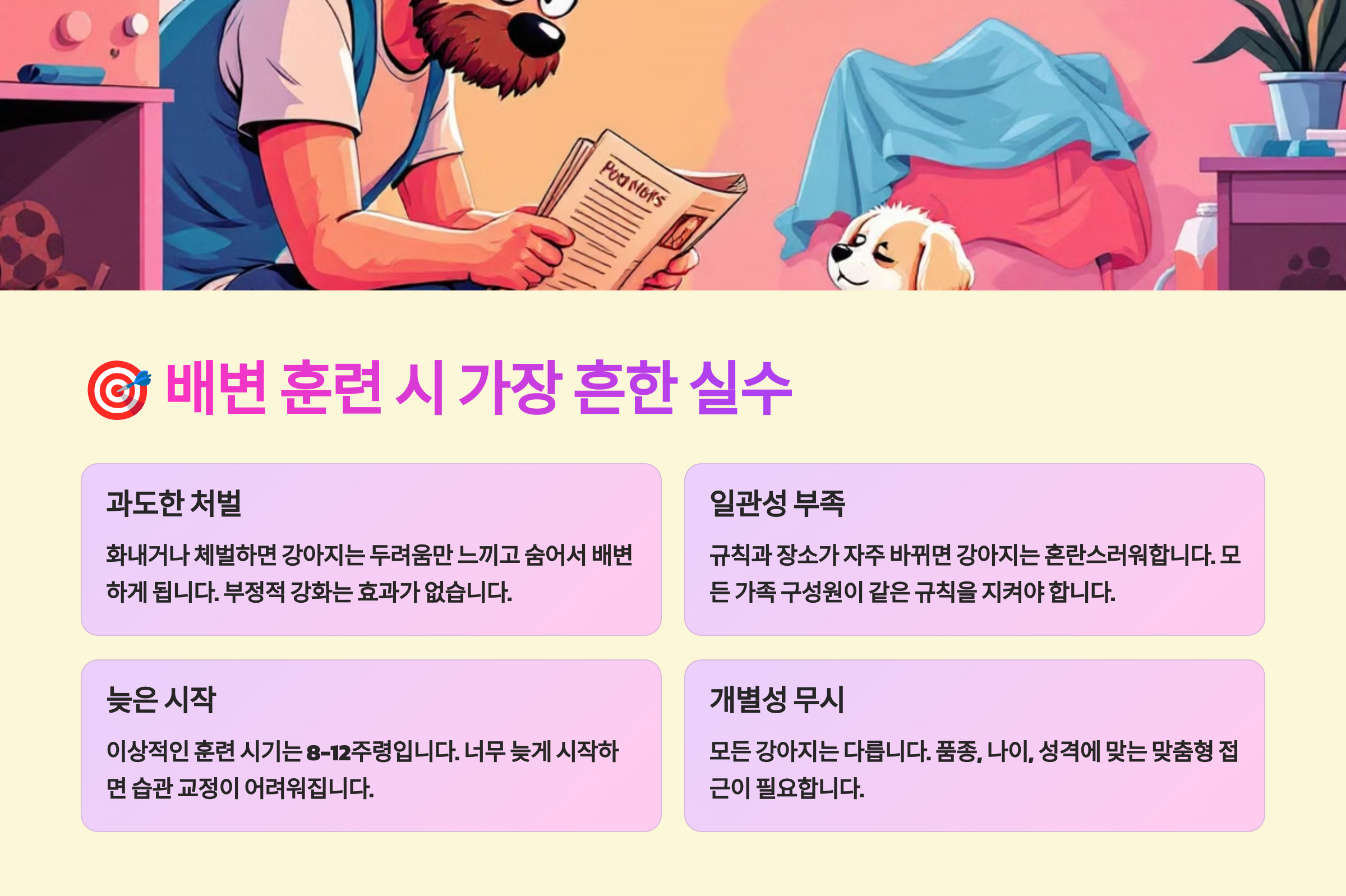 💡 강아지의 실수는 훈련 과정의 일부예요! 인내심을 가지고 반복 훈련하면 올바른 배변 습관을 가질 수 있어요.