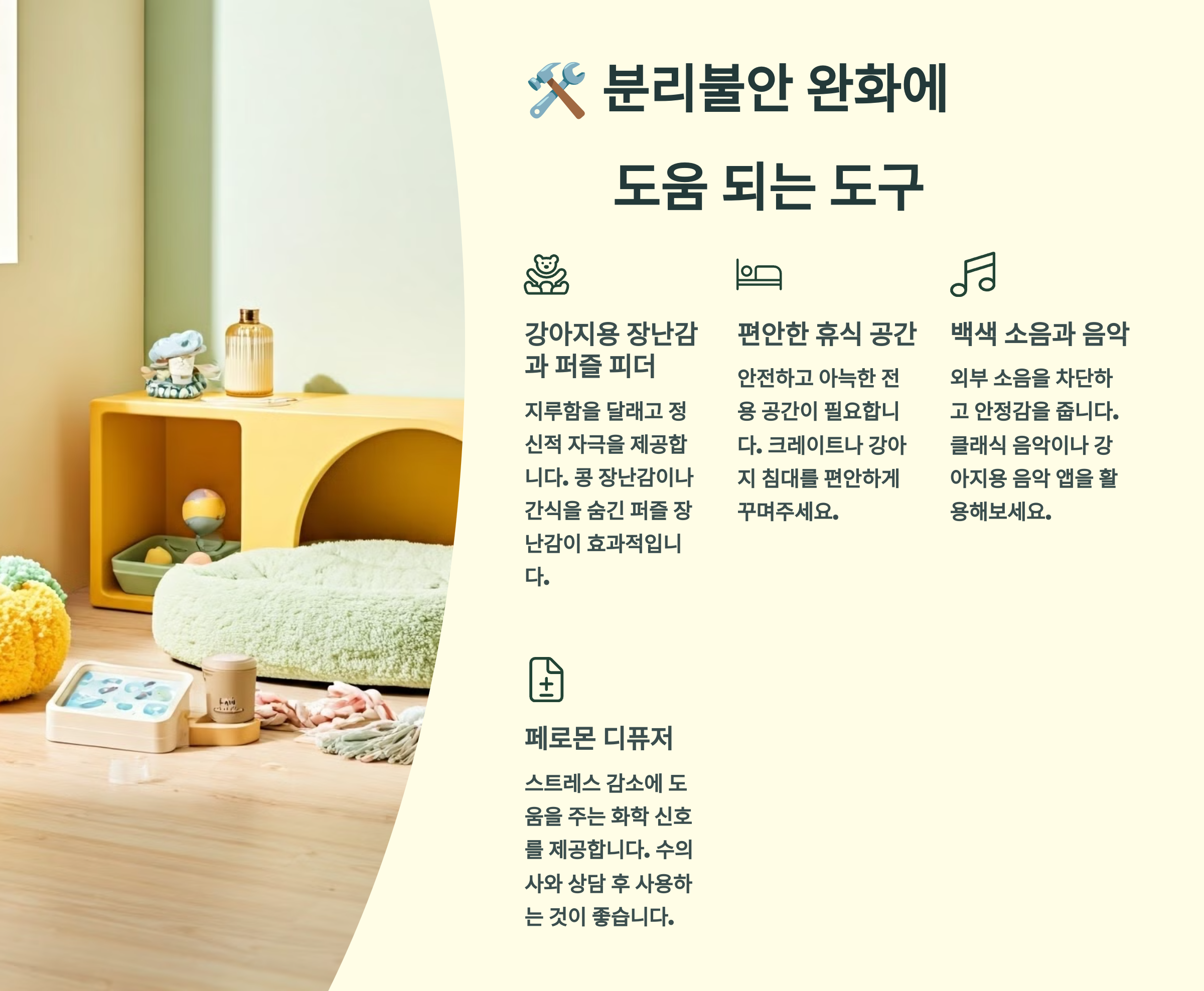 💡 훈련과 함께 사용할 수 있는 분리불안 완화 도구들도 알아볼까요? 🛠️