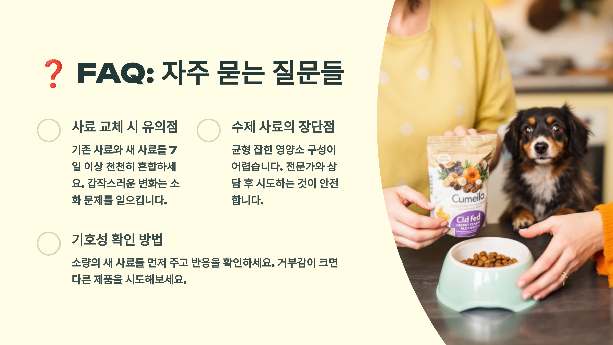 💡 강아지마다 기호성과 소화 능력이 다르기 때문에, 새로운 사료를 줄 때는 천천히 적응할 시간을 주는 것이 중요해요!