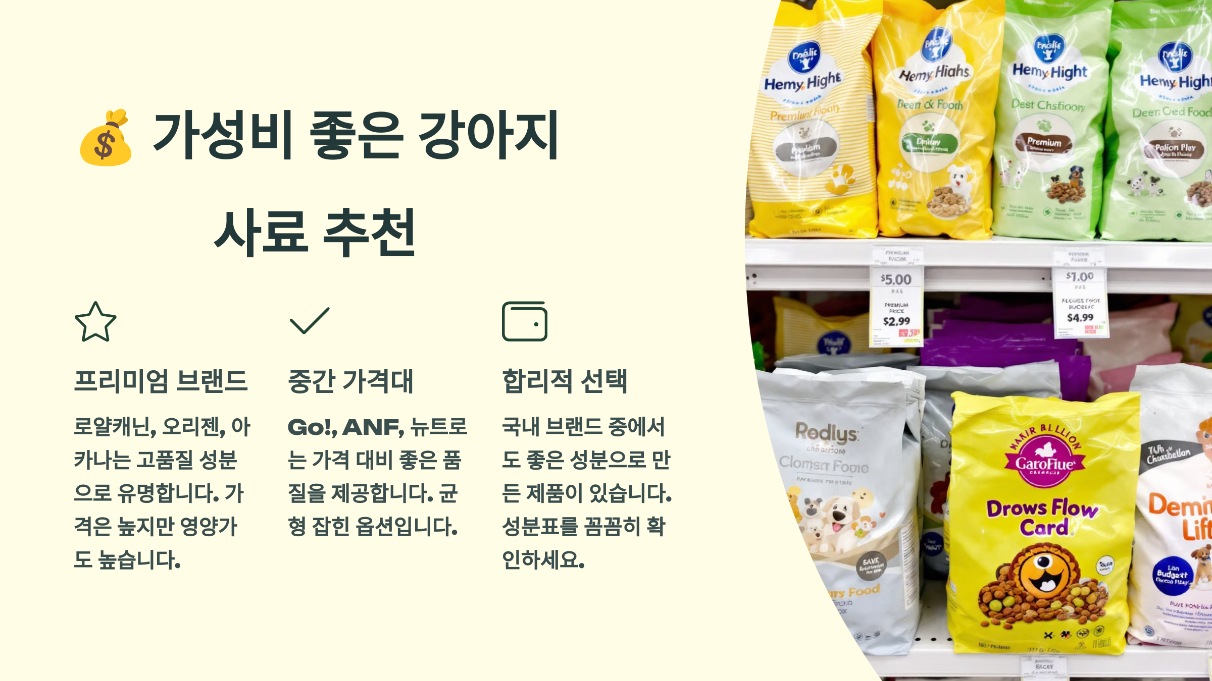 🐕 강아지 사료를 고를 때 가격도 중요한 요소예요. 비싼 프리미엄 사료도 좋지만, 적절한 가격에 좋은 품질을 갖춘 가성비 좋은 사료를 찾는 것이 중요해요!