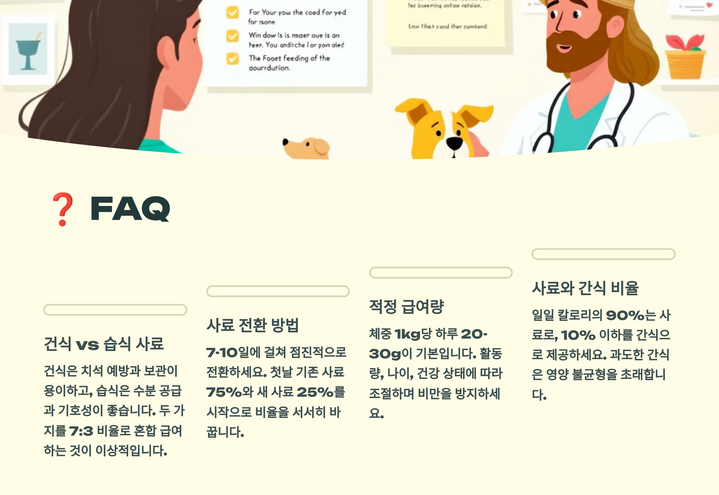 🥩 갑자기 사료를 바꾸면 소화 불량을 일으킬 수 있어요. 기존 사료와 새 사료를 점진적으로 섞어 7~10일 동안 천천히 변경하는 것이 좋아요.