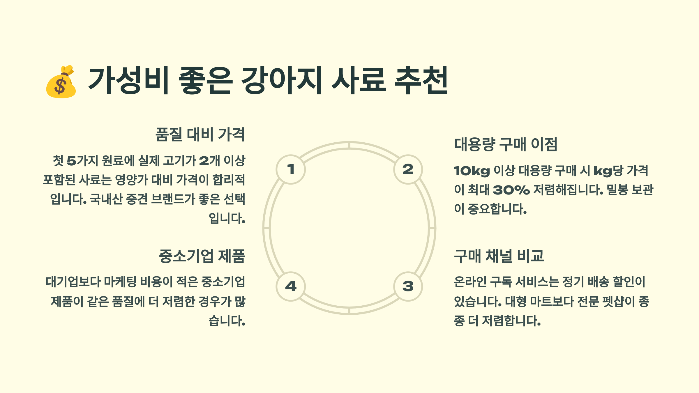 🐕 강아지 사료를 고를 때 가격도 중요한 요소예요. 비싼 프리미엄 사료도 좋지만, 적절한 가격에 좋은 품질을 갖춘 가성비 좋은 사료를 찾는 것이 중요해요!