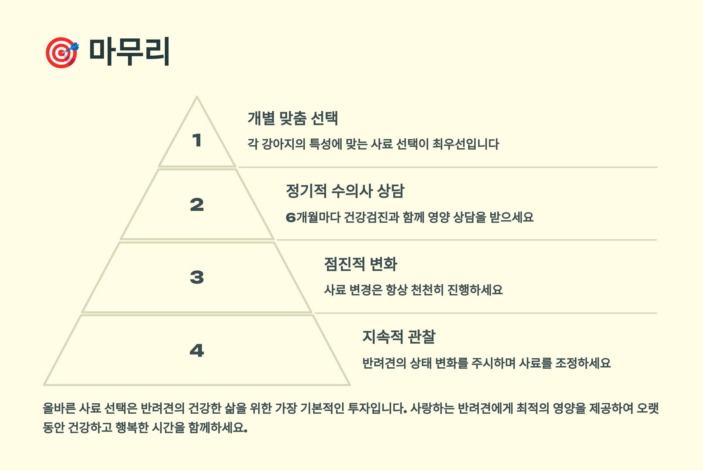 🐶 강아지 사료 선택은 단순히 맛있는 것을 주는 것이 아니라, 건강을 위한 필수적인 과정이에요! 반려견의 행복한 삶을 위해 올바른 사료를 선택해 주세요. 😊