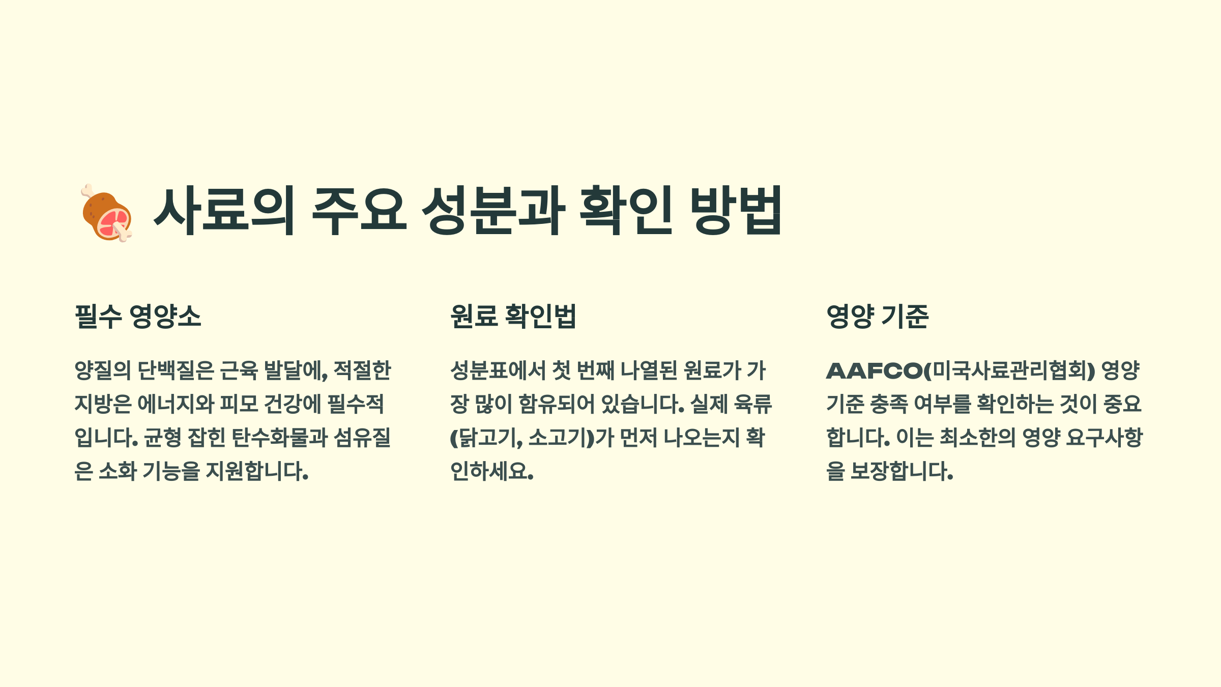 🐕🦺 사료 성분표를 확인할 때는 원재료의 첫 번째 항목이 육류인지 체크하는 것이 중요해요. 첫 번째로 표기된 성분이 사료의 주요 원료이기 때문이에요. 😊