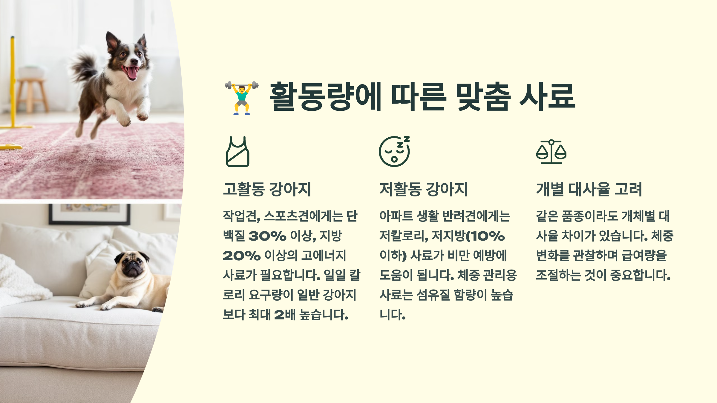 🐕 강아지마다 성격과 활동량이 다르기 때문에 에너지 소비량에 맞는 사료를 선택하는 것이 중요해요. 활동량이 많은 강아지는 더 많은 에너지를 필요로 하고, 반대로 실내에서 조용히 지내는 강아지는 칼로리를 조절해야 해요.