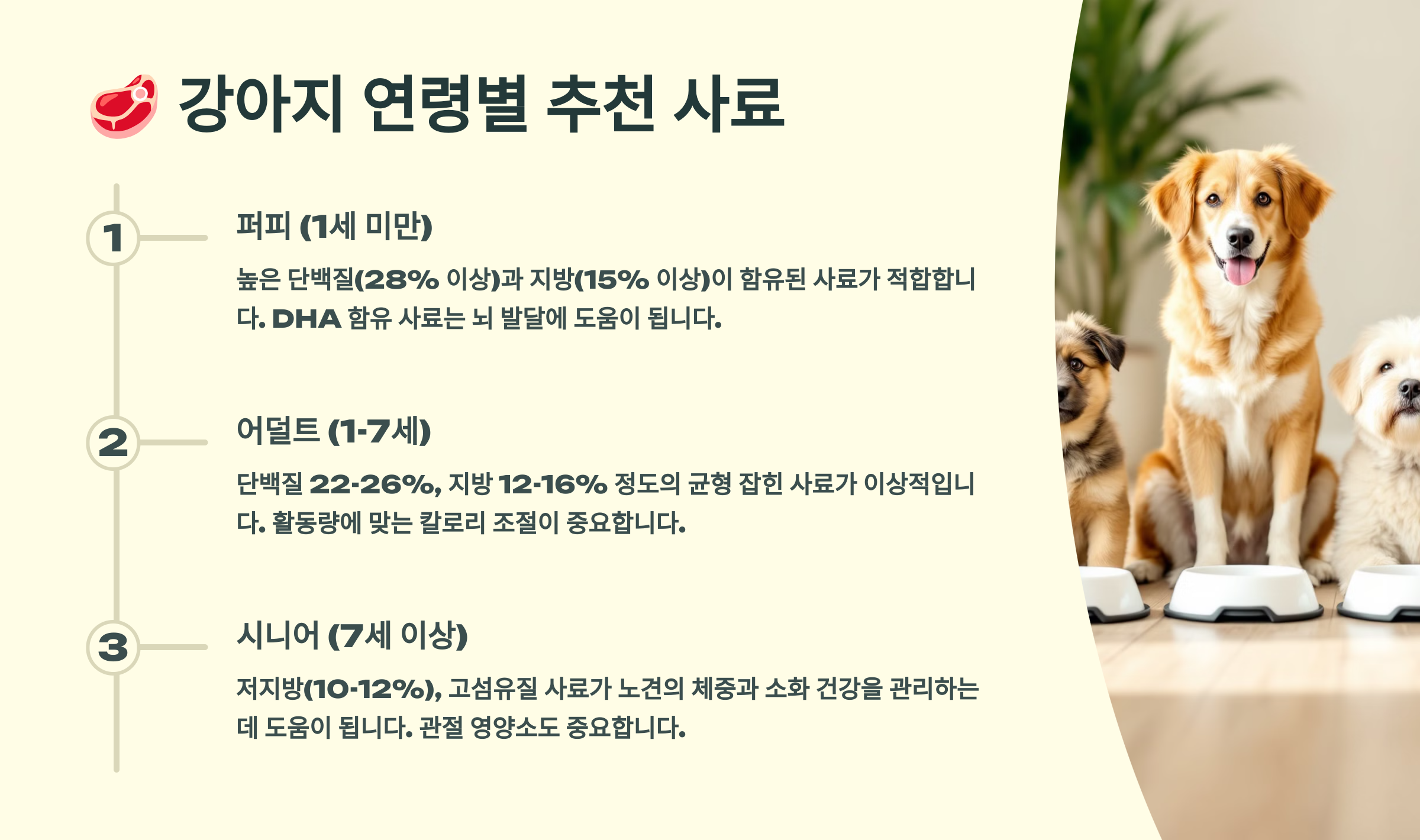🦴 노령견(7세 이상) - 소화 기능이 떨어지기 때문에 저지방, 고단백 사료를 먹이는 것이 좋아요. 관절 건강을 위해 글루코사민과 콘드로이틴이 포함된 제품도 추천해요!