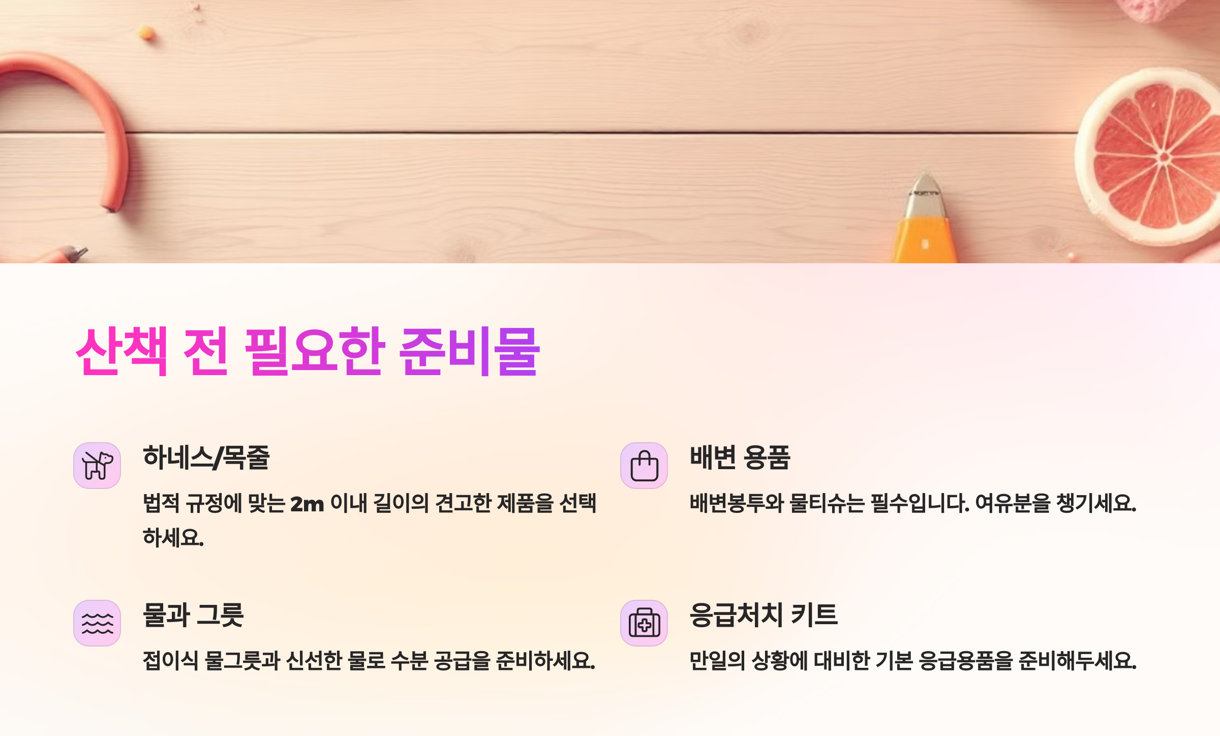 👜 산책을 나가기 전에는 꼭 챙겨야 할 준비물들이 있어요! 리드줄, 배변봉투, 간식은 기본이죠. 간단한 장난감이나 물도 함께 준비하면 더욱 좋아요.