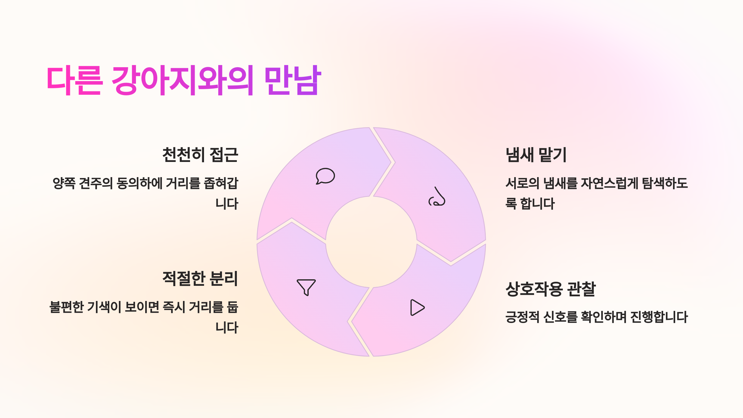 👃 강아지들은 냄새로 인사해요. 천천히 다가가게 하고, 리드줄을 느슨하게 유지해서 자유롭게 냄새를 맡게 해줘야 해요. 억지로 인사시키는 건 금물!