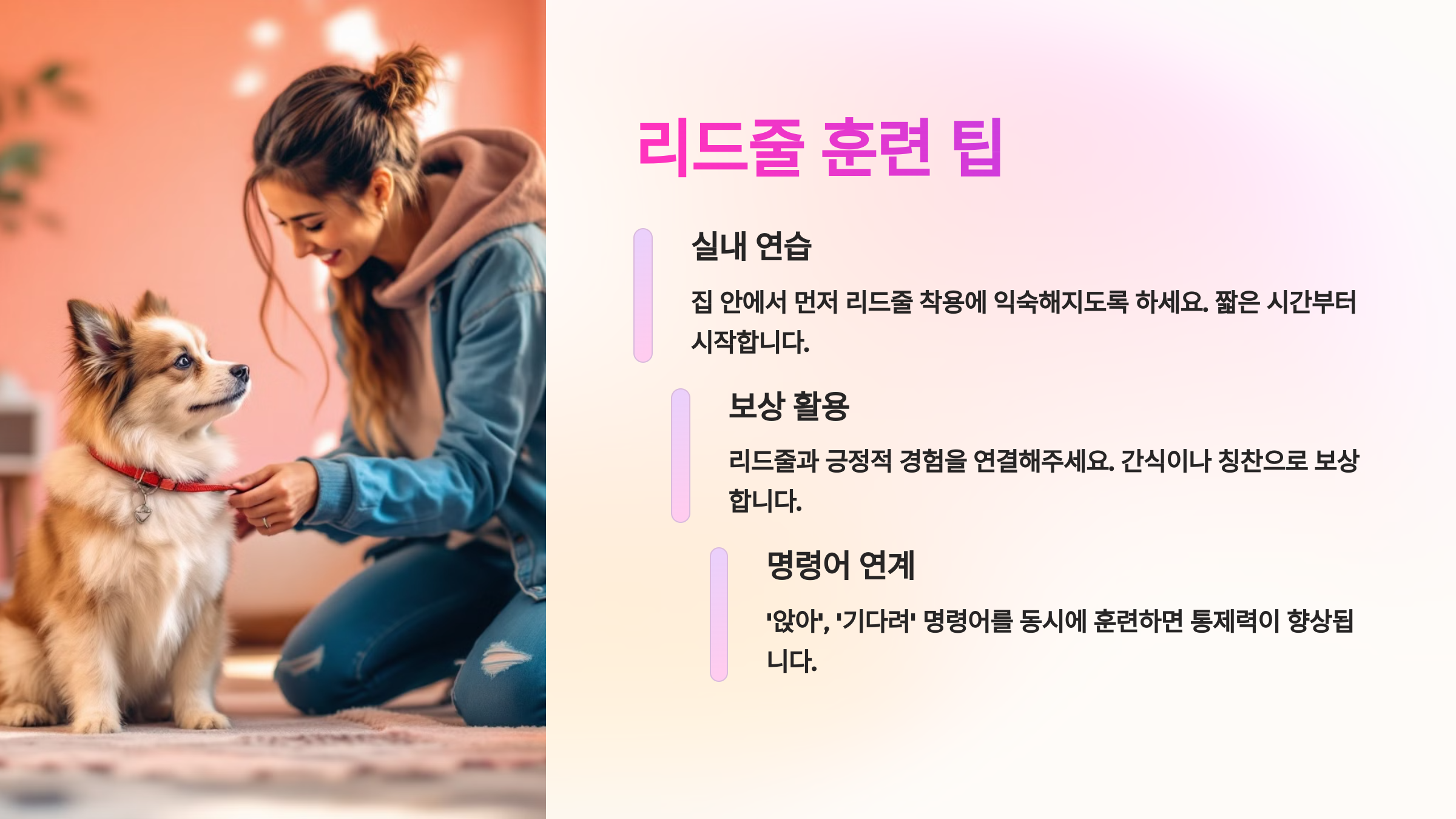 🐾 리드줄 훈련은 산책 예절의 기본이에요. 강아지가 앞으로 마구 끌고 가지 않도록 걷는 속도와 방향을 조절할 수 있어야 해요. 그렇지 않으면 둘 다 피곤해지겠죠!