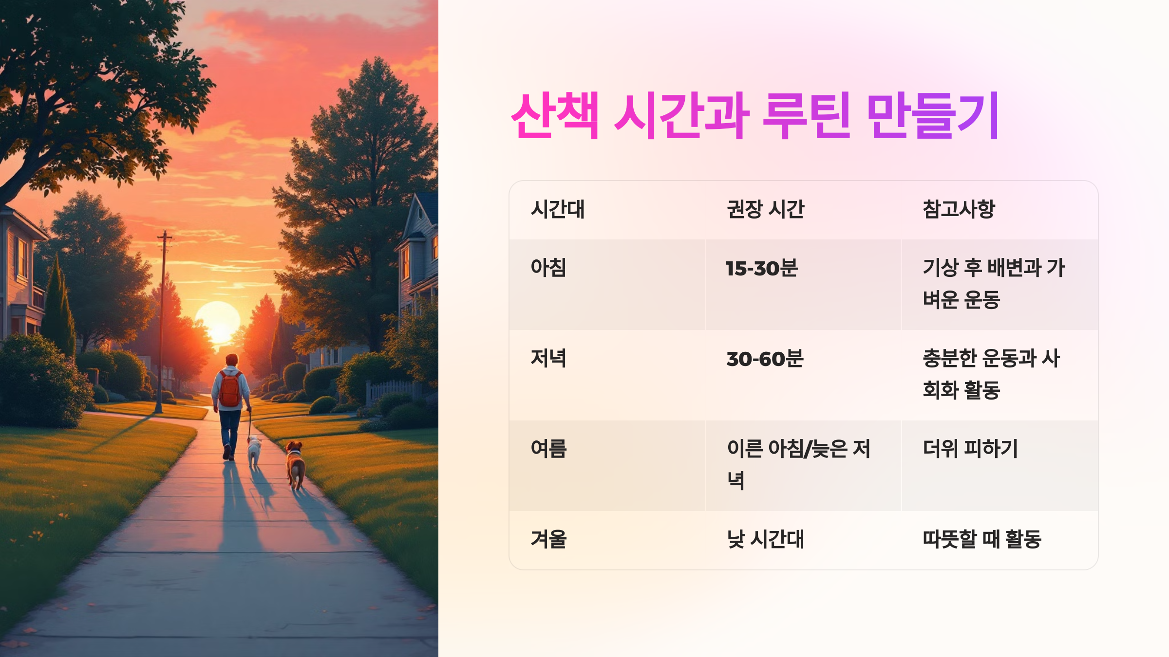 ⏰ 산책 시간은 나이, 품종, 건강 상태에 따라 달라요. 보통 하루 30분~1시간이면 충분하지만, 활동량 많은 친구들은 2번 나가도 좋아요!