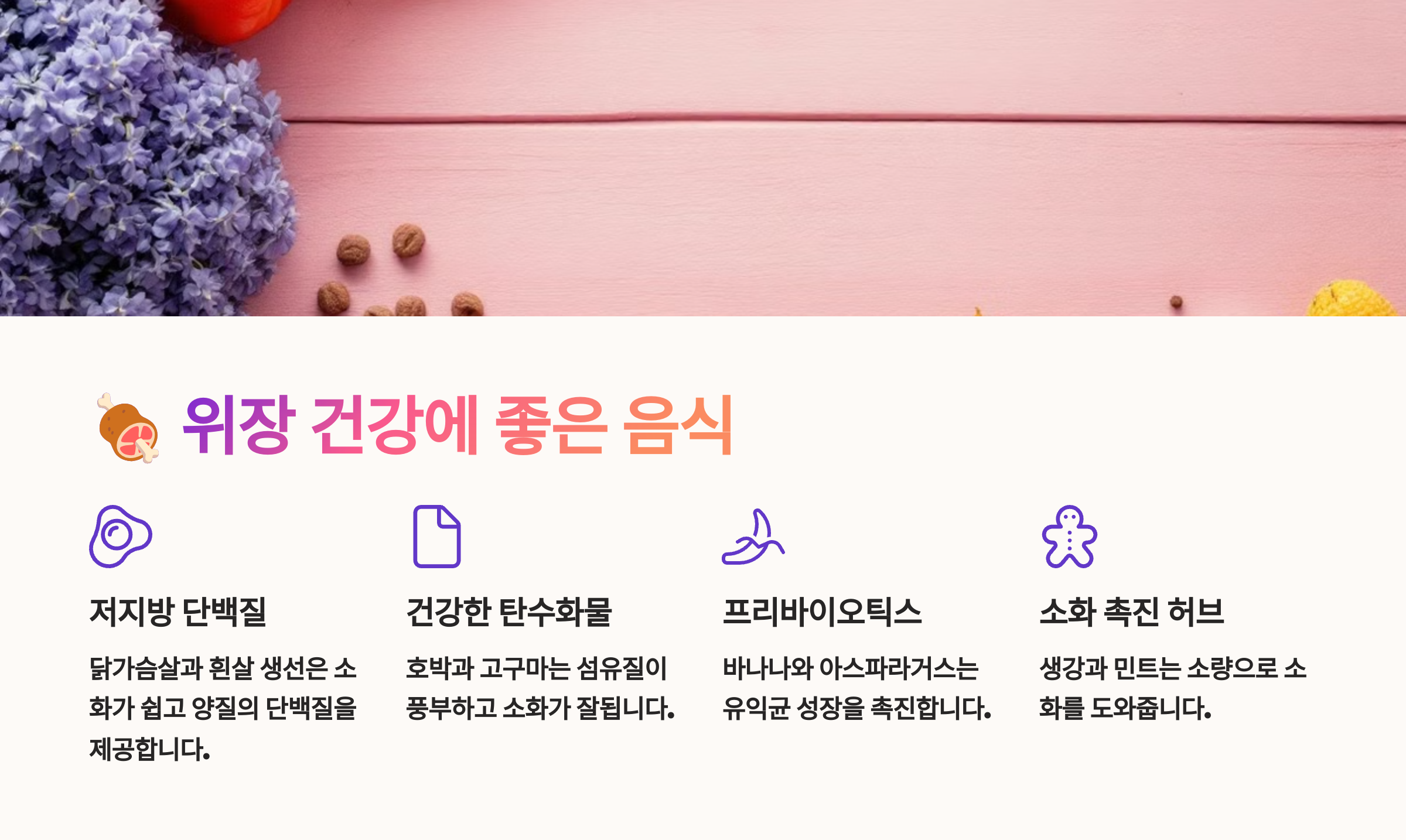 다음 섹션에서는 위장 건강에 좋은 음식을 알아볼까요? 🍖
