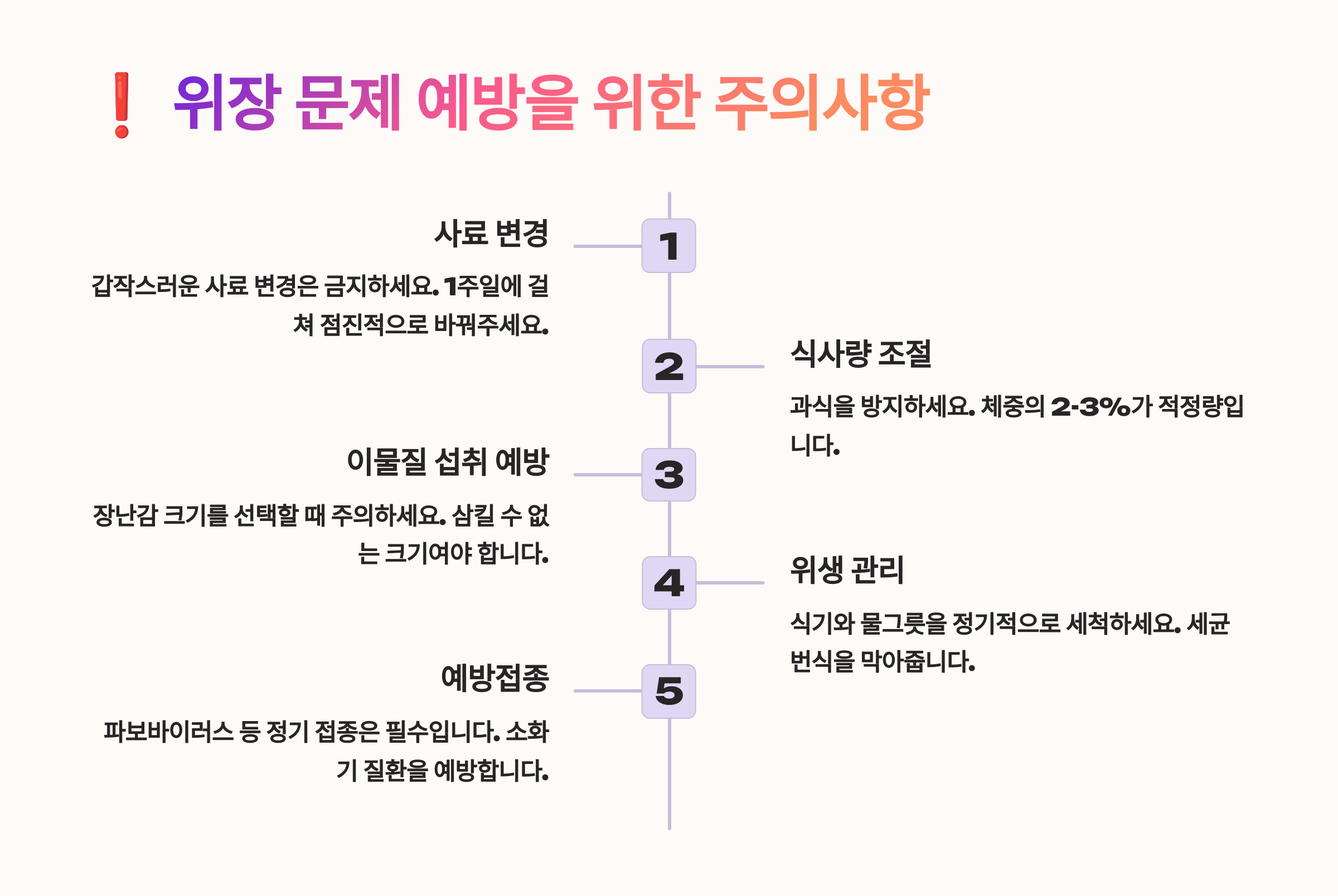 - ✅ 갑작스러운 사료 변경 금지 (기존 사료와 섞어 천천히 교체)