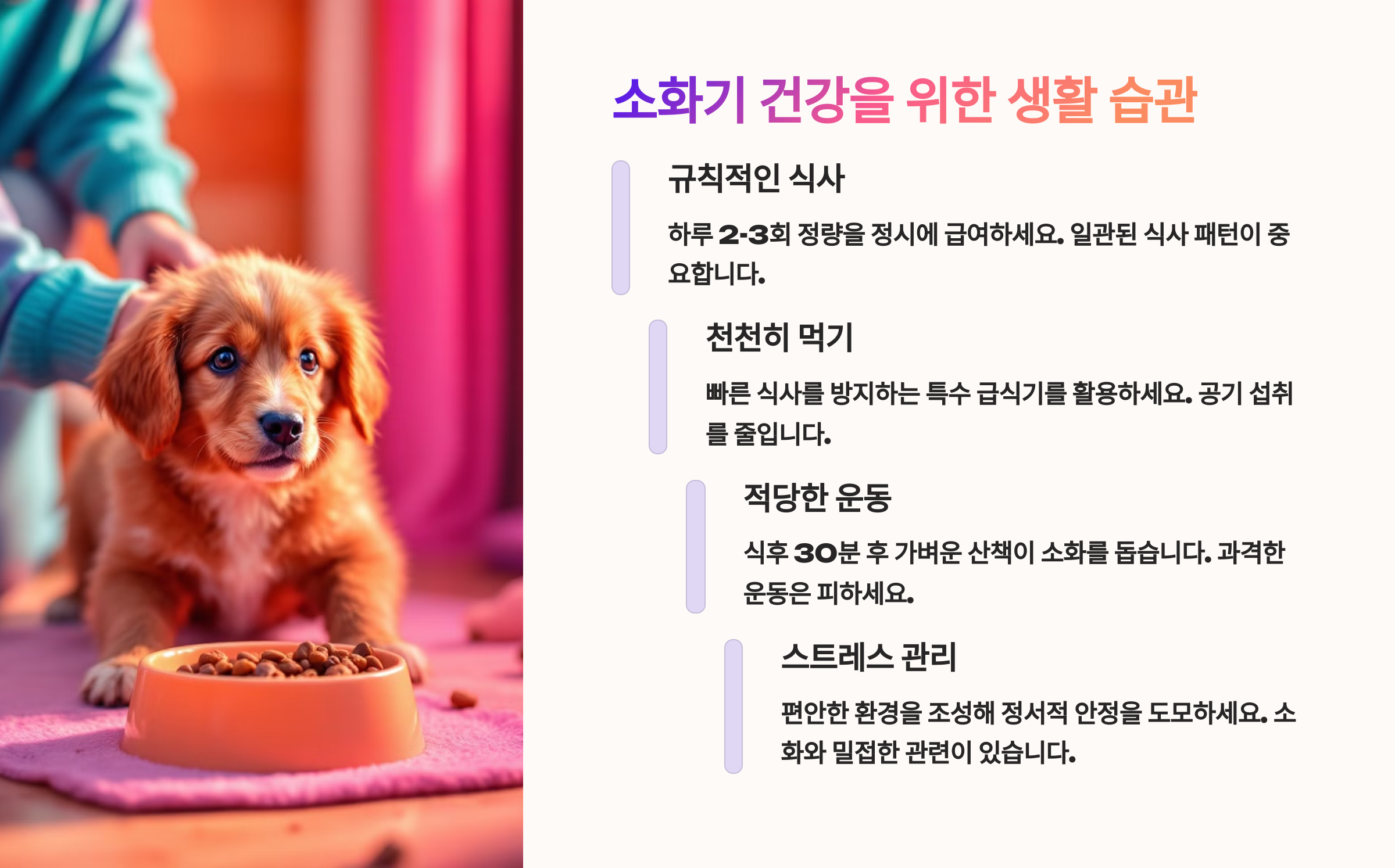 - ✅ 음식 섭취 후 적절한 휴식 제공 (위 운동이 원활하게 진행될 수 있도록)