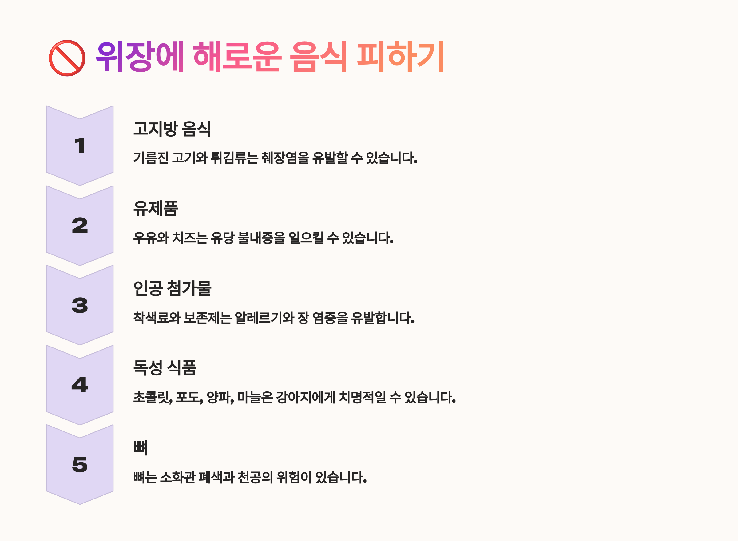 📢 강아지의 위장 건강을 지키기 위해 해로운 음식은 반드시 피해주세요! 🛑