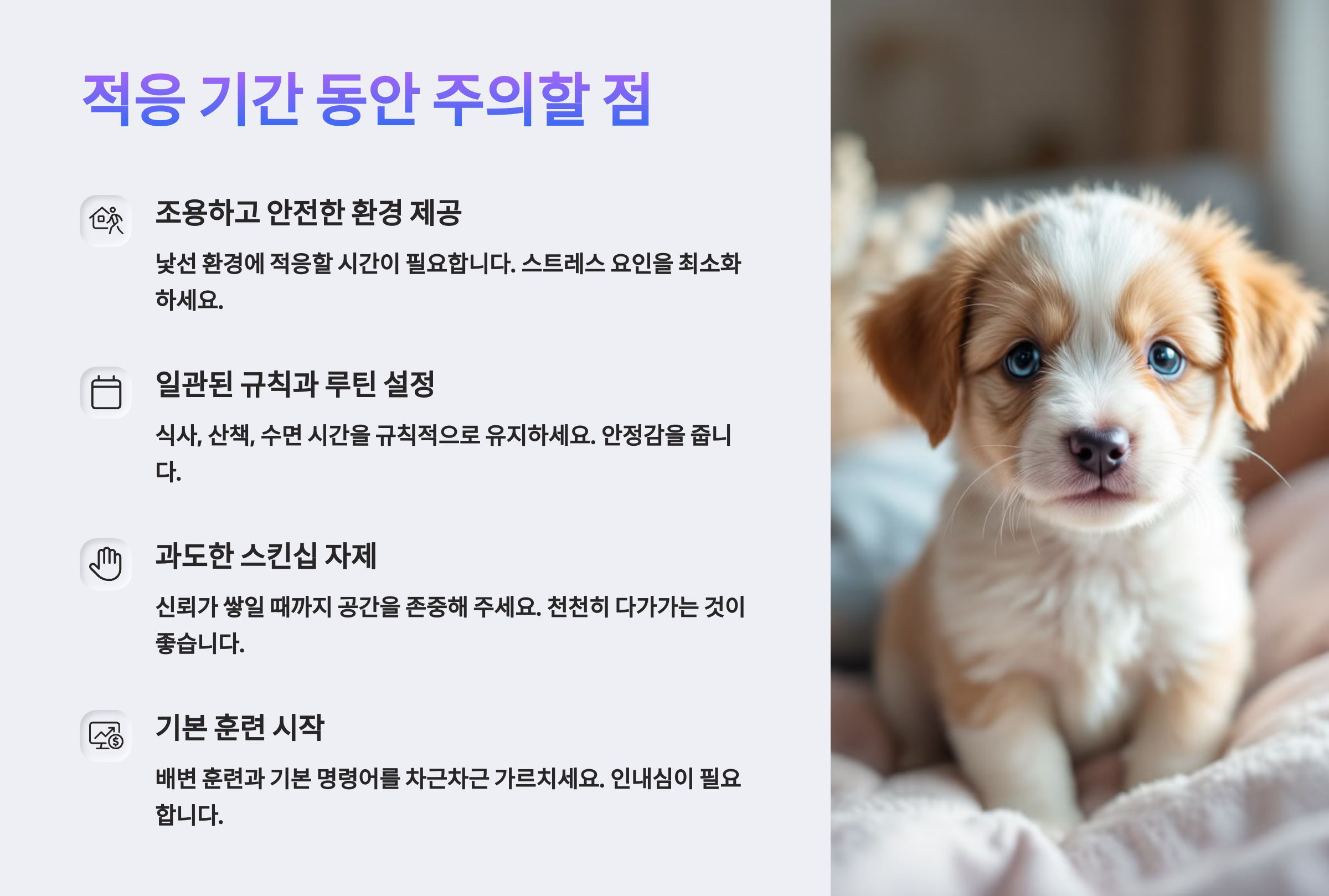 이제 준비물을 챙겼다면, 강아지가 처음 우리 집에 적응할 수 있도록 도와줘야겠죠? 다음 섹션에서는 적응 기간 중 보호자가 주의해야 할 점을 정리해드릴게요! 🐕🏠