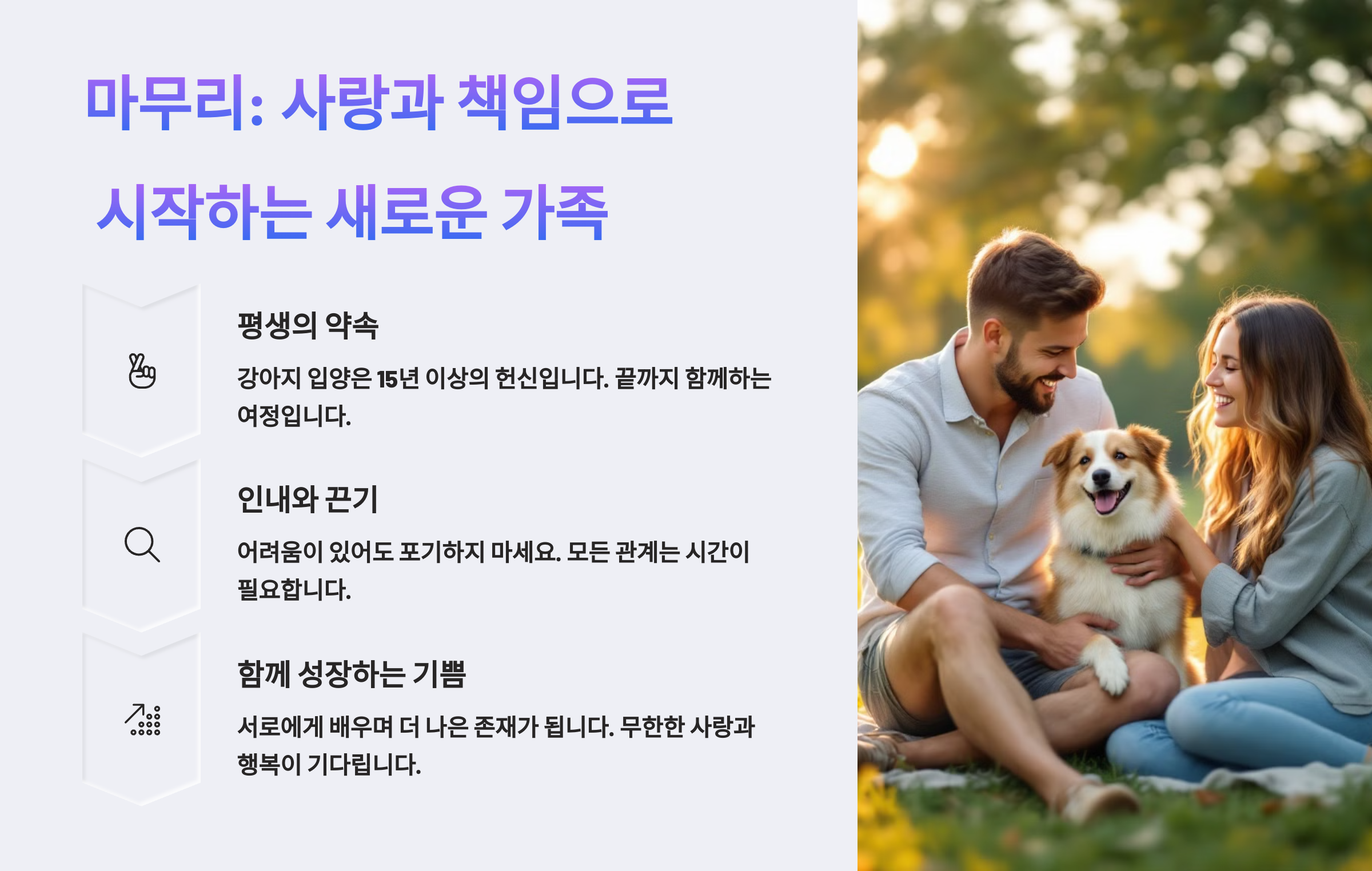 이제 여러분은 단순한 입양인이 아니라, 진짜 보호자예요. 하루하루를 함께 살아가는 소중한 친구에게 따뜻한 사랑과 신뢰를 줄 수 있는 사람이 되어주세요 🌱