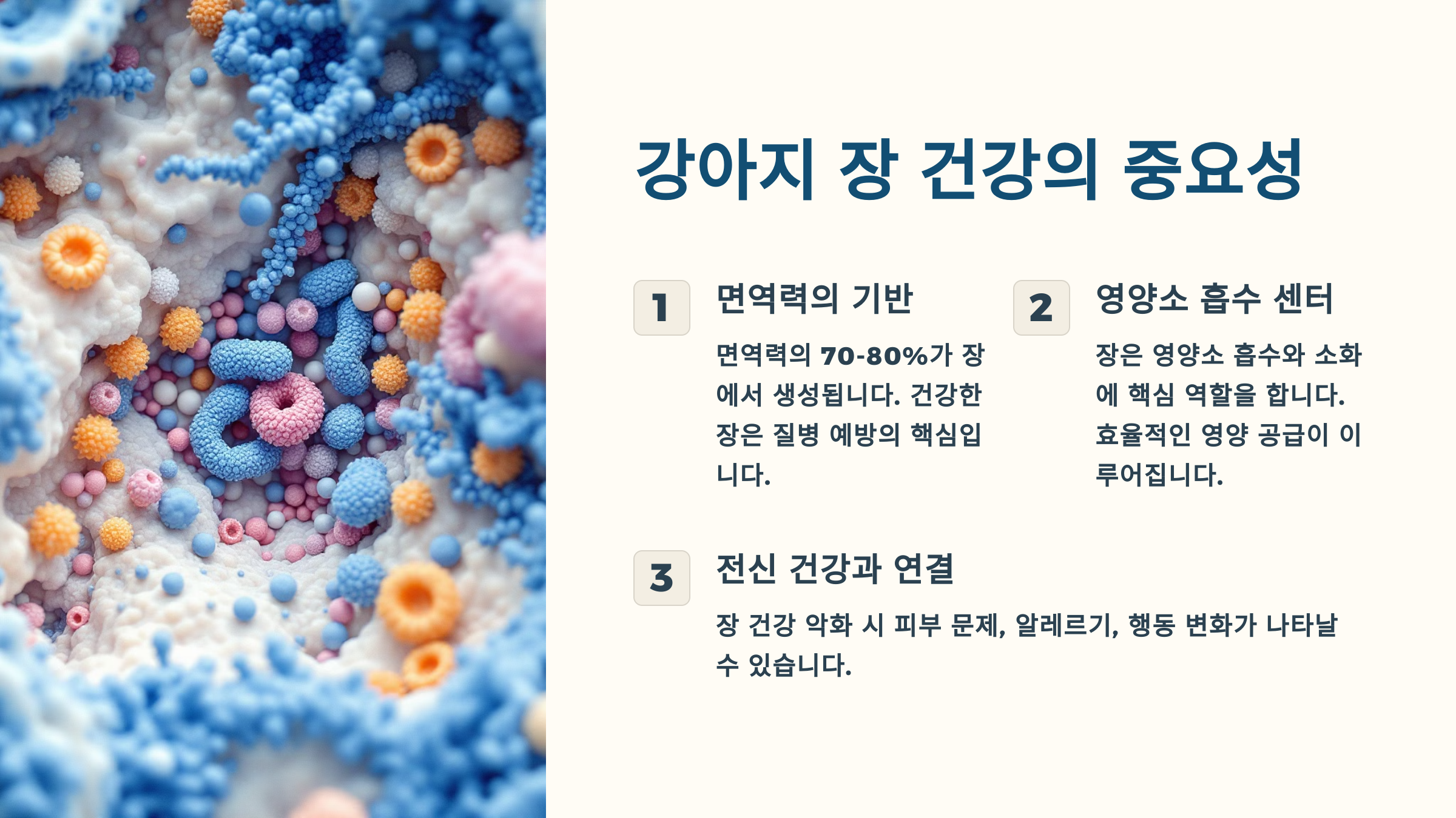강아지의 장은 단순한 소화 기관이 아니라 면역력의 70%를 담당하는 중요한 기관이에요! 🦠🐶