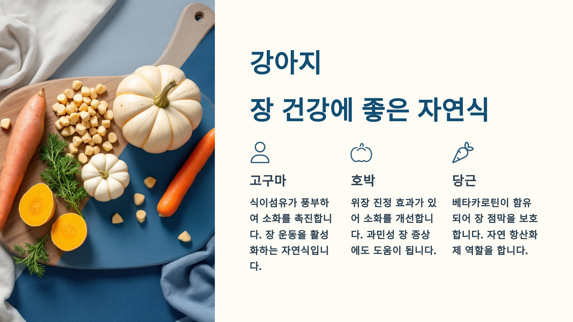 - 🥔 고구마: 장을 부드럽게 하고 배변 활동을 원활하게 해줘요.