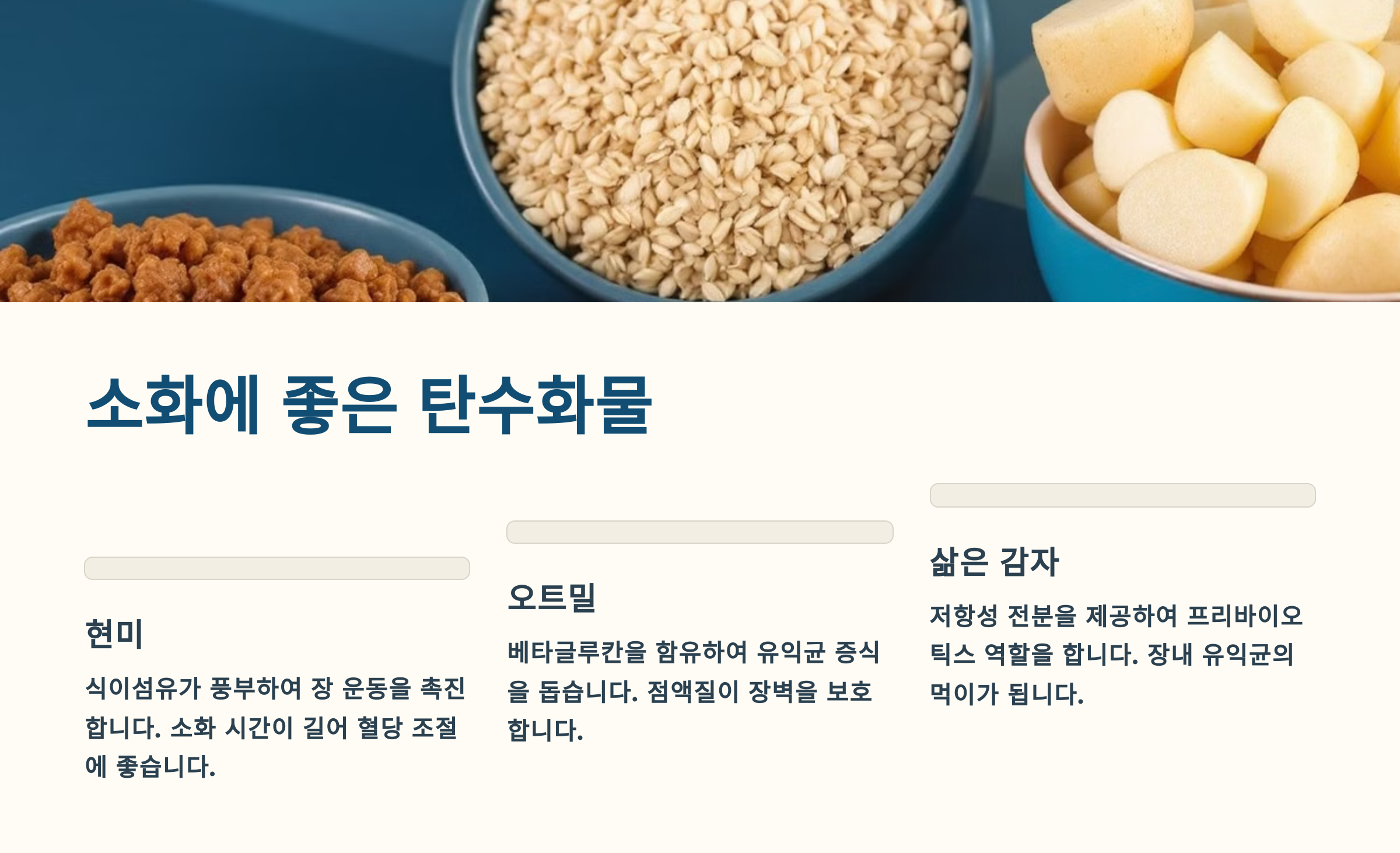 - 🌾 오트밀: 수용성 식이섬유가 많아 장내 유익균 증가