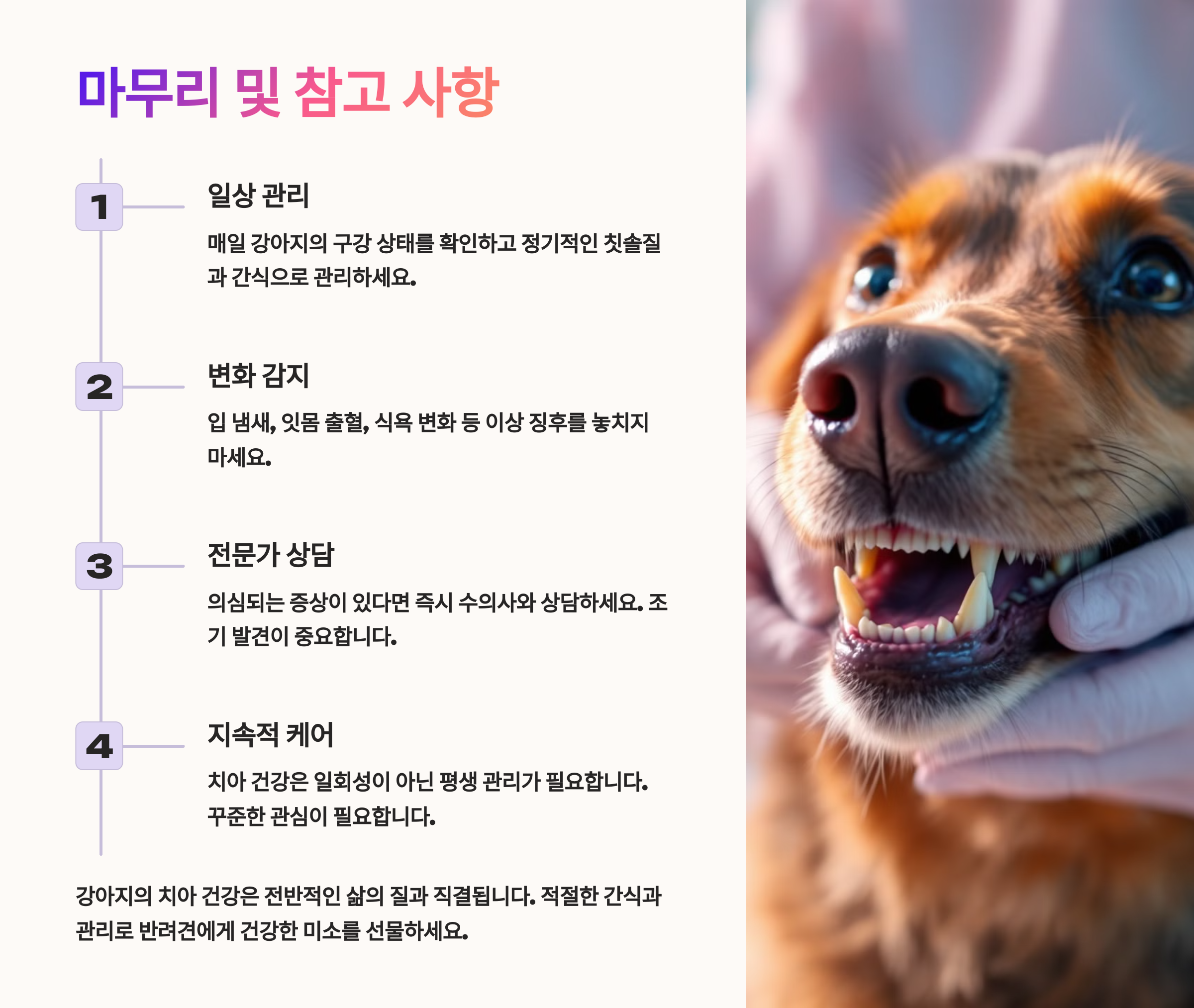 - ✅ 정기적인 치과 검진 (6개월~1년에 한 번 수의사 방문)