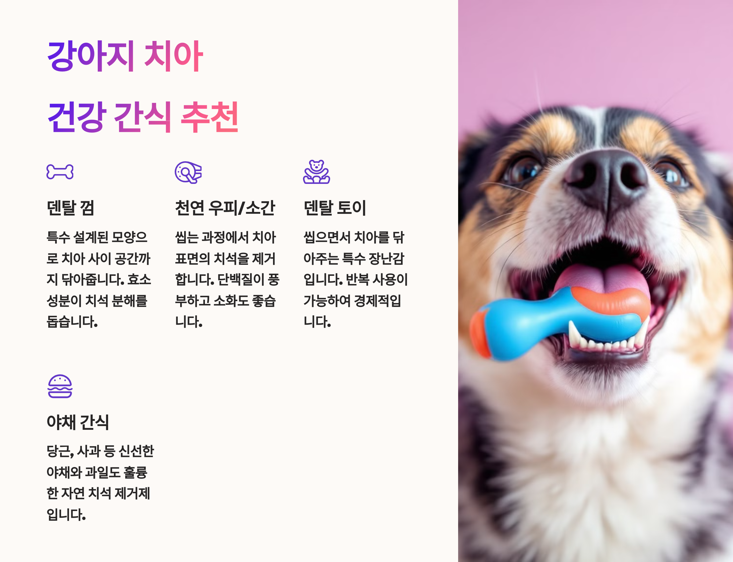 - ✅ 잇몸이 약한 강아지 → 부드러운 덴탈껌 선택