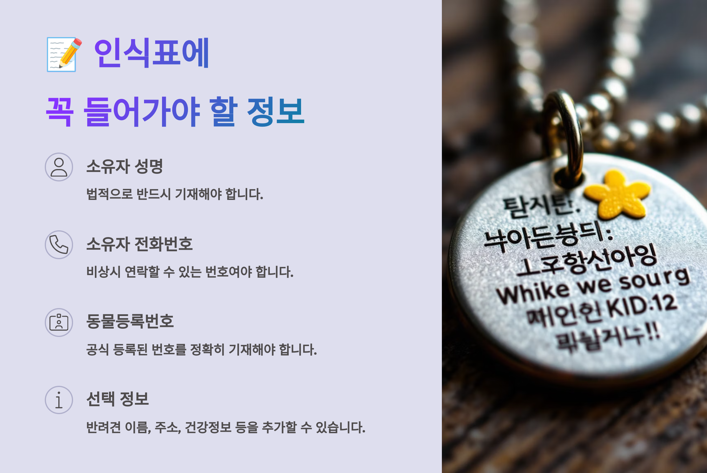 인식표에는 반드시 등록번호 또는 보호자 연락처가 있어야 해요. 상호 명칭이 없어도 상관없지만, 긴급 상황 시 빠르게 연락이 가능해야 한다는 점이 핵심이죠. 보호자의 성함을 함께 새기는 것도 도움이 돼요. 📞👤