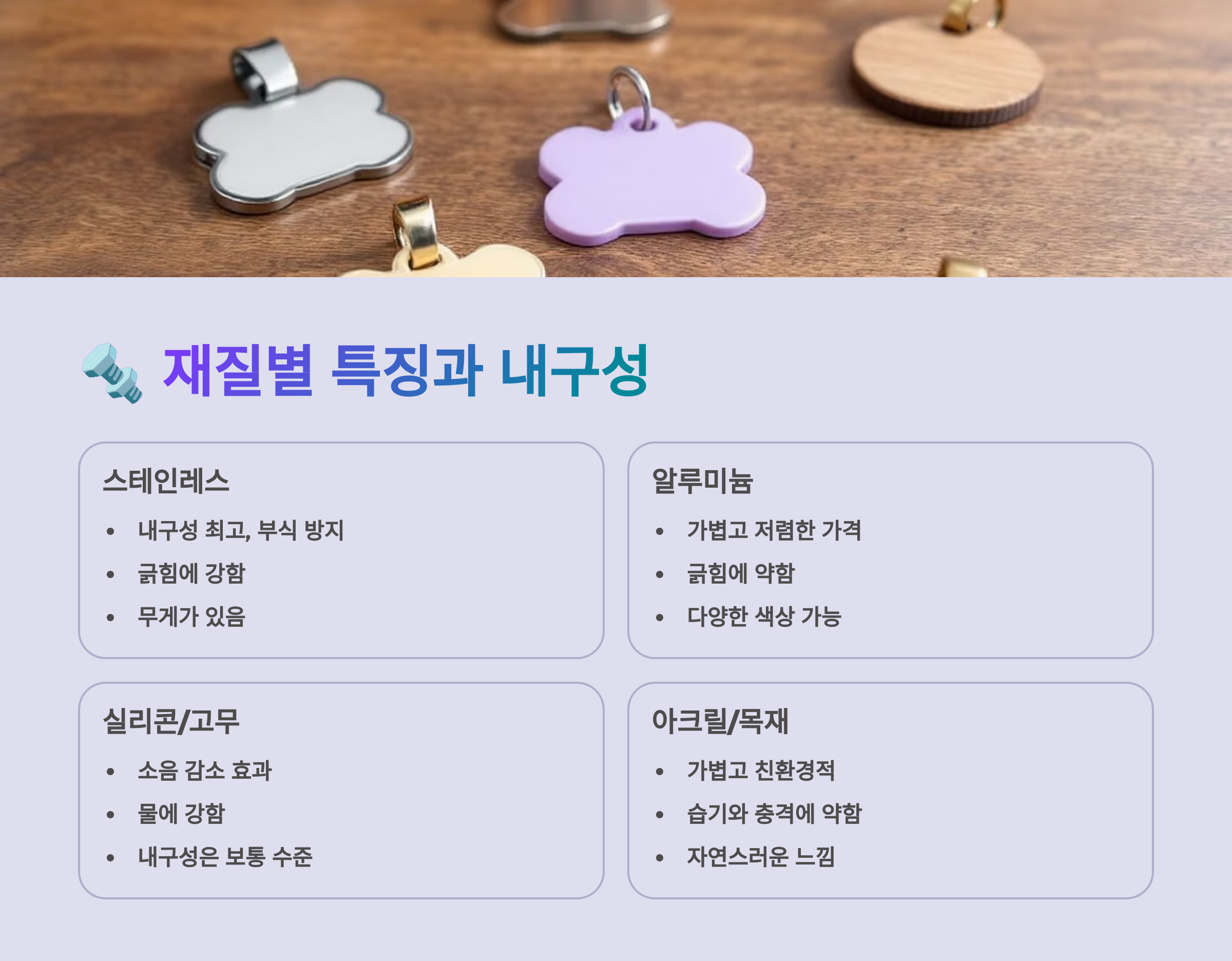 이제 어떤 정보가 꼭 필요한지 알게 되셨죠? 다음은 🔩 재질별 특징과 내구성 섹션이에요! 우리 아이에게 가장 적합한 인식표 소재는 뭘까요? 🐕🔧
