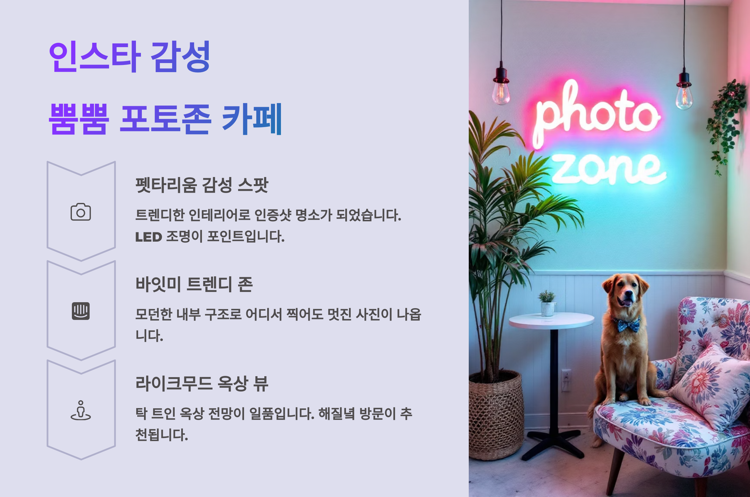 📸 강아지와 함께 찍은 사진은 우리의 소중한 추억이 되죠. 요즘은 포토존이 잘 되어있는 감성 카페들이 많아서, 특별한 날을 기념하기에 완벽한 장소들이 많아요. 반려견과의 ‘인생샷’ 찍고 싶다면 이 섹션 주목!