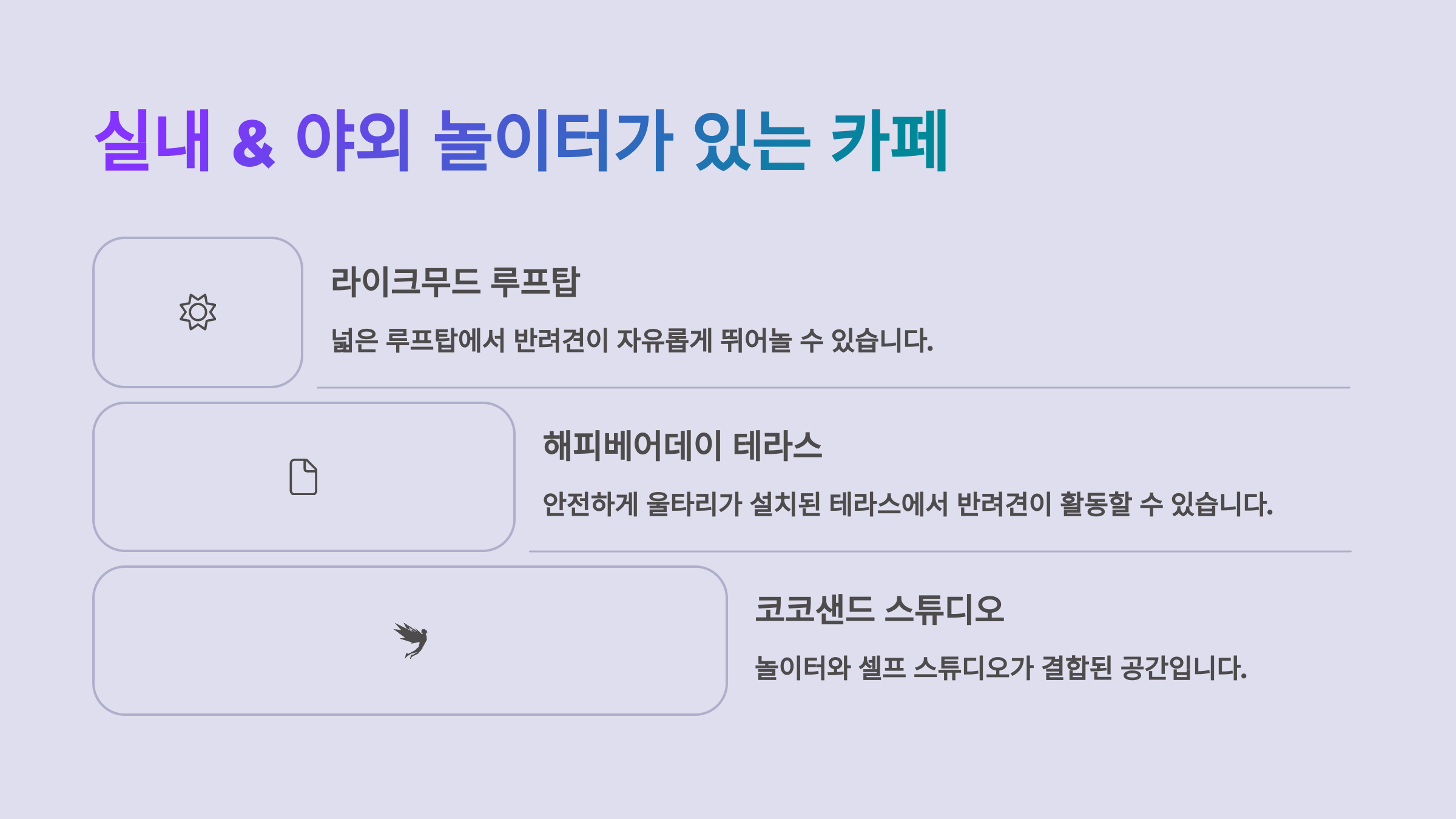 | 카페명 | 위치 | 놀이 공간 | 추천 견종 |