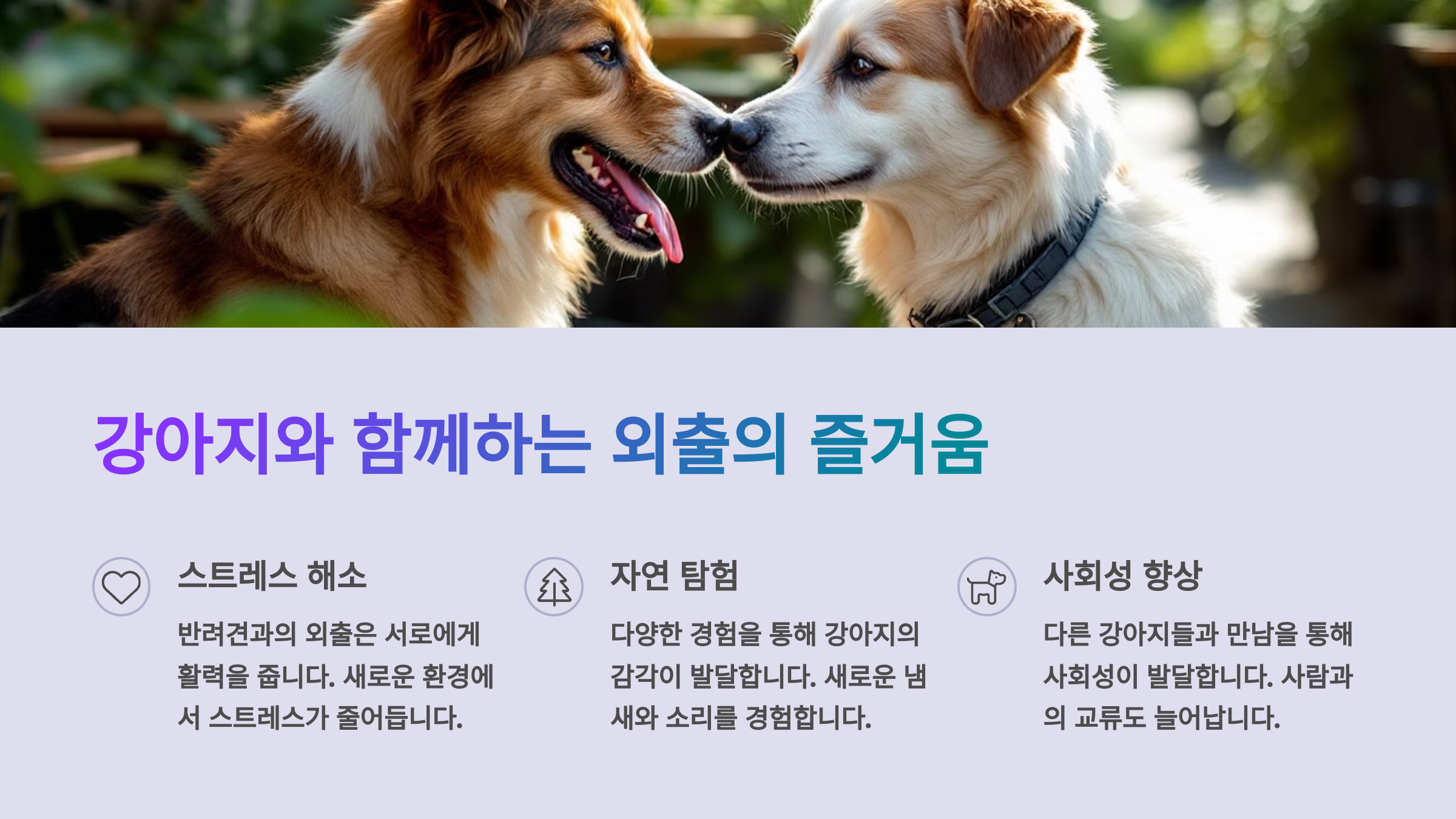 | 정서 안정 | 외출은 반려견의 스트레스를 줄여줘요 |