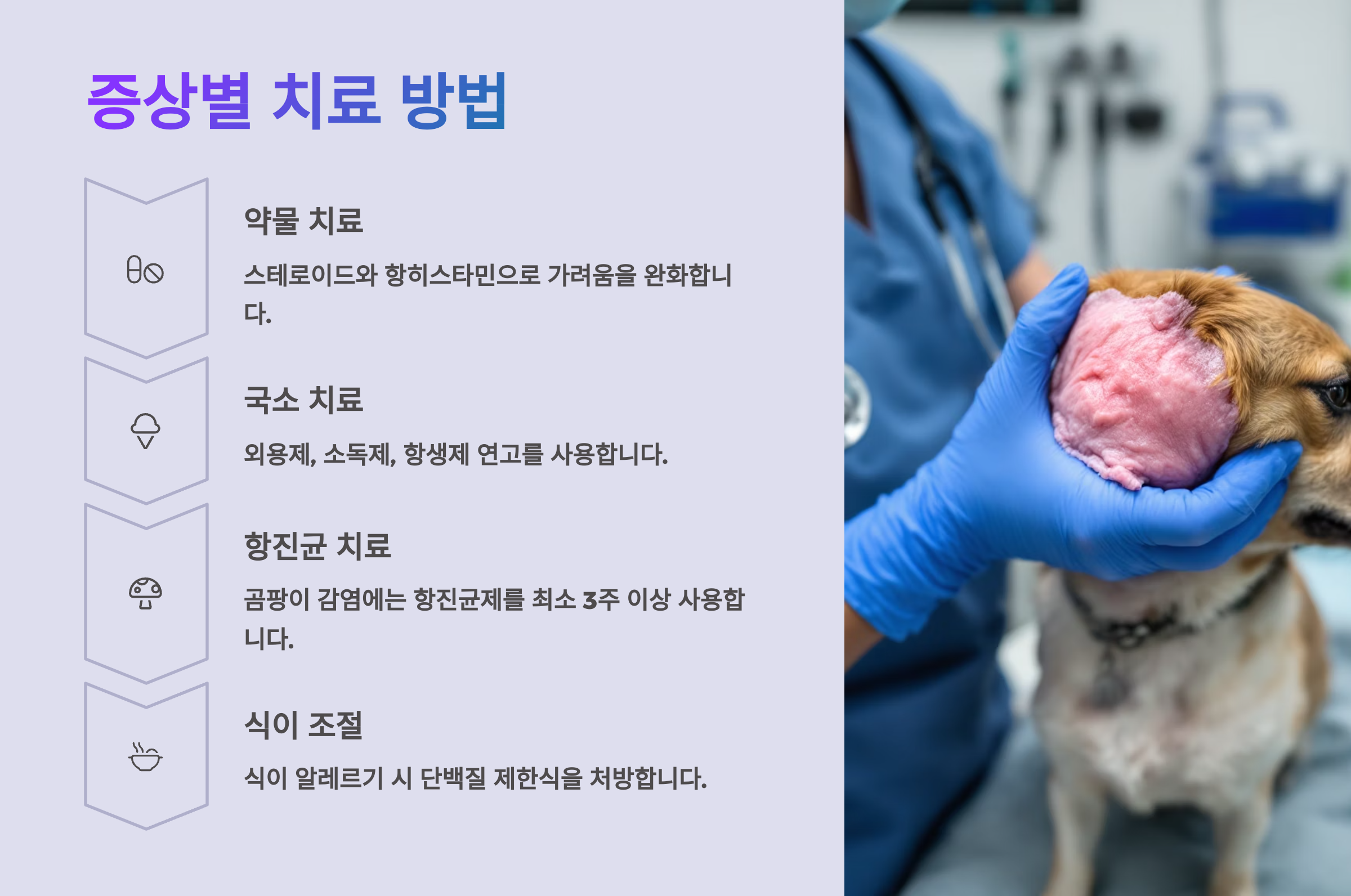 🐾 예를 들어 알레르기성 피부염은 식이 조절, 항알레르기 약, 면역치료를 병행하고, 진드기 감염은 구충제와 샴푸 치료가 기본이에요. 곰팡이 감염은 전염성이라 치료 + 격리가 필수예요.