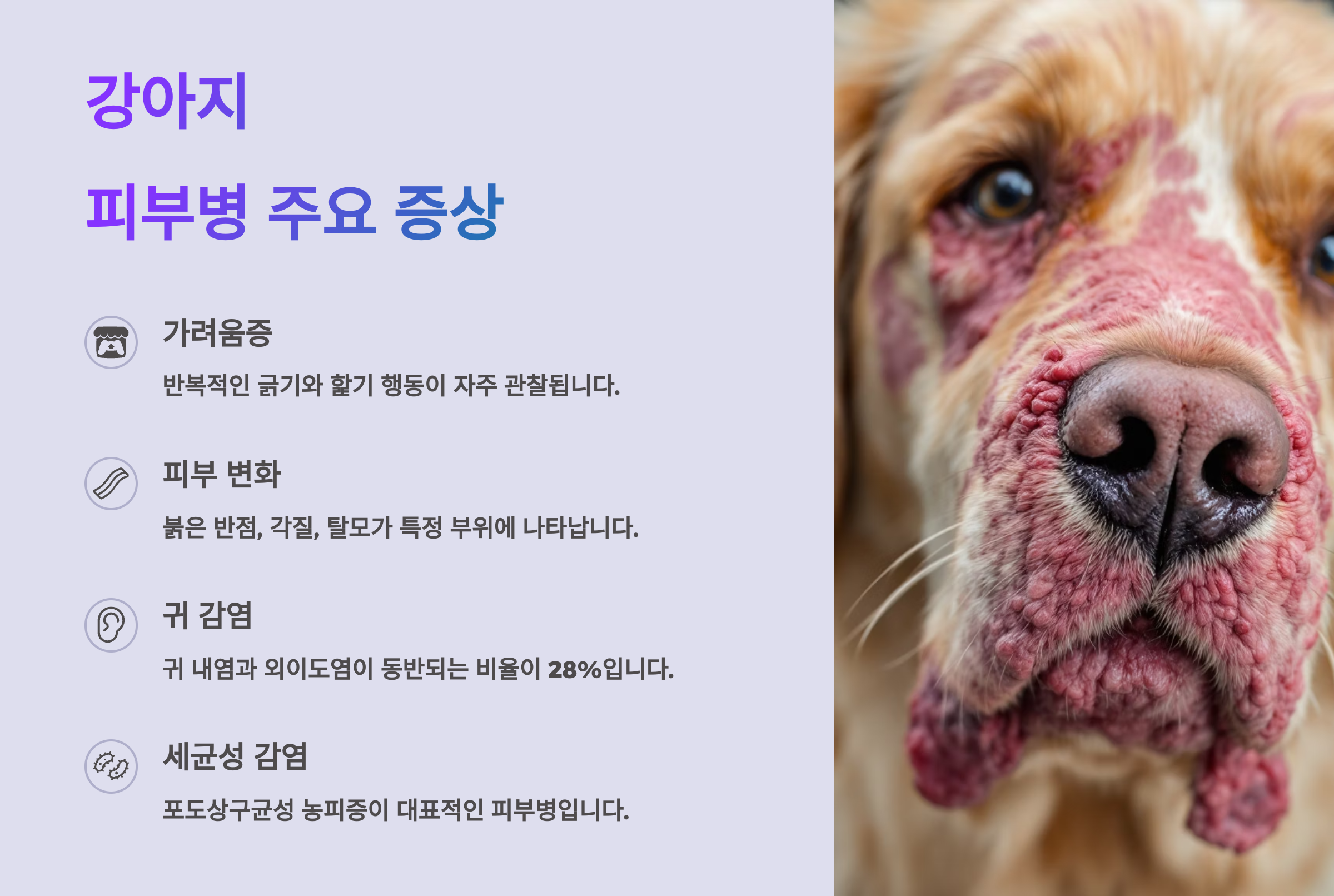 📌 반려동물의 건강은 피부에서 시작된다고 해도 과언이 아니에요. 다음 섹션에서는 강아지 피부병의 주요 증상을 자세히 알아볼게요. 간단한 증상이 아니라면 바로 체크해줘야 해요!